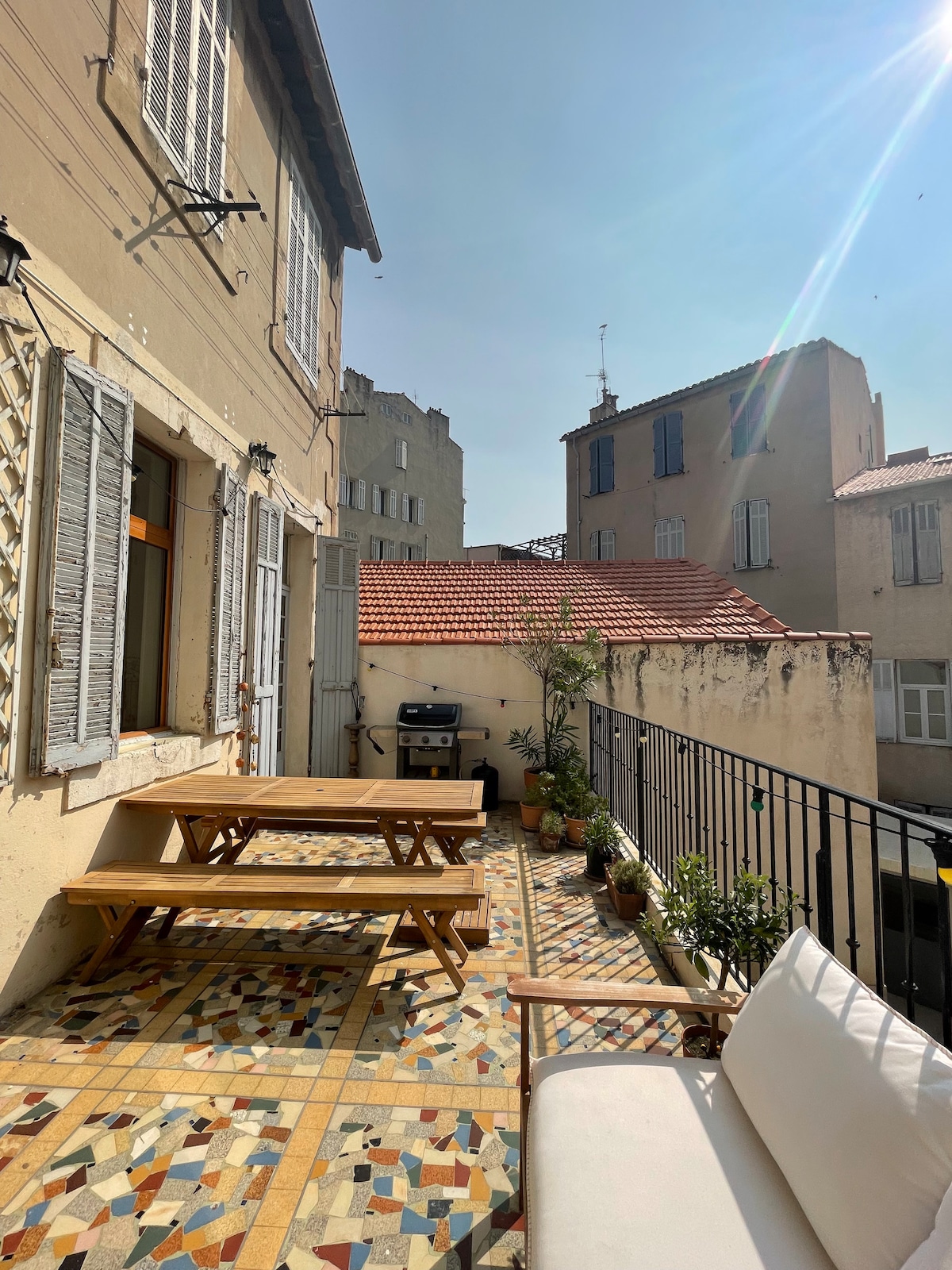 A deux pas du vieux port, dans l'un des meilleurs quartiers de Marseille, loft de charme de 40 m2 entièrement rénové avec parquet de chêne, poutres apparentes, terrasse de 8 m2, équipé internet, machine à laver, etc... Situé au 1er étage, climatisation réversible, visiophone ... Supermarché, restaurants, commerces et parking public sécurisé (payant) à proximité...