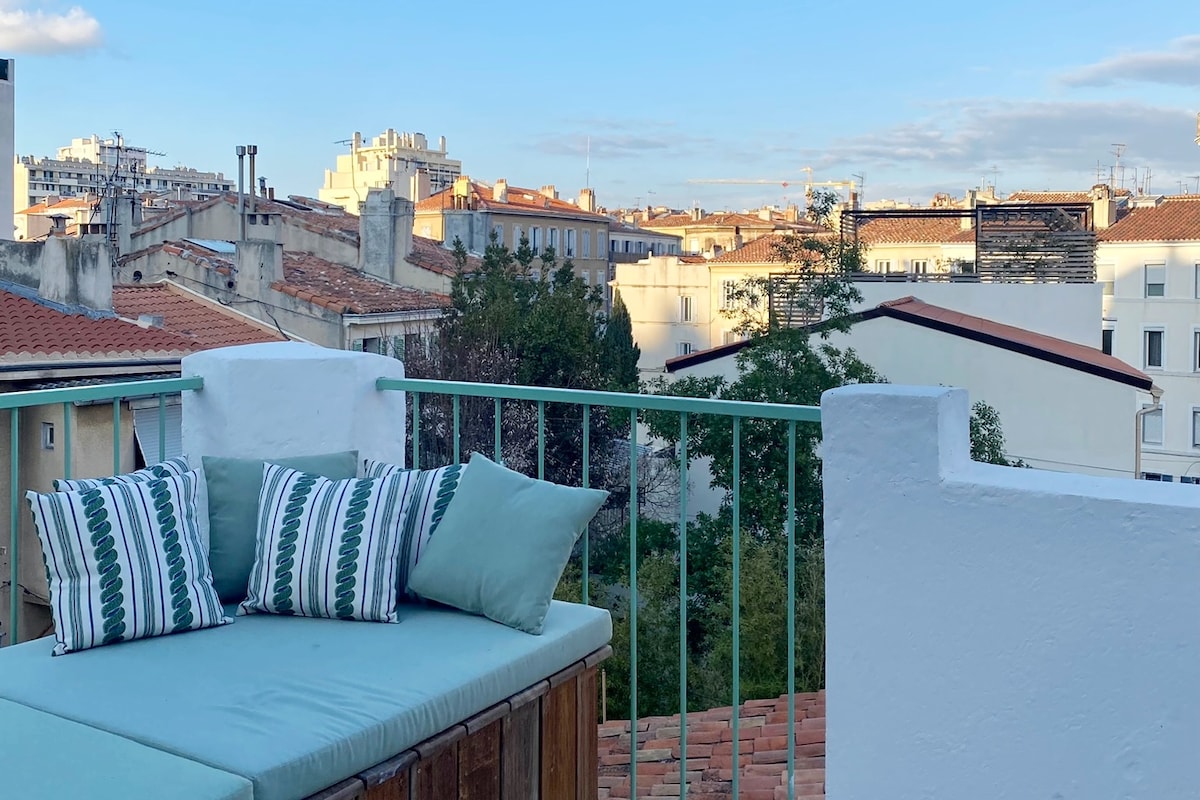 T2 de 45m2, Quatrième étage sans ascenseur. Grande terrasse et vue sur Notre Dame de la Garde, lumineux, cuisine équipée, salon, 1 chambre, salle de bains / douche, WC. Proche Cours Julien et Vieux Port, restaurants, transports. Gare Saint Charles à 15 min à pied (ou métro Notre Dame du Mont) Cosy flat with amazing view, fourth floor (no lift). Central Marseille, near Cours Julien and Vieux Port. Saint Charles railway station, 15 min walking (or metro Notre Dame du Mont)