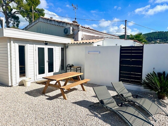 A 15 min de la mer (st Cyr les lecques et Bandol), et proche du circuit du Castellet (notamment Bol d'or) maisonnette type chalet de 24m2 sur jardin joliment arboré de 1500m2 non cloturé. BBQ au feu de bois, table de jardin et bains de soleil, hamac, jeux pour enfants (balançoire, tricycle et maisonnette) 1 chambre avec lit 2 pers + 2 lits 1 pers en "bannette" salle d'eau avec WC + douche extérieur "retour de plage" au soleil couchant - option linge de maison possible. merci ^^ .