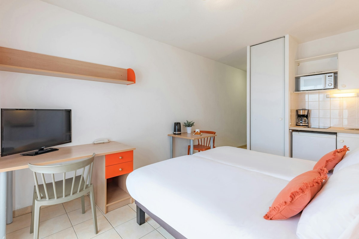 Relax in our cosy and comfortable double studios (18sqm), equipped with a double bed or pull-out bed depending on at conguration or a sofa bed, air-conditioning, soundproof windows, blackout curtains and a at screen TV. You will also enjoy the work area with a phone and wireless internet. For your comfort, the bathroom is equipped with a towel dryer. The kitchen corner will make your stay easier.