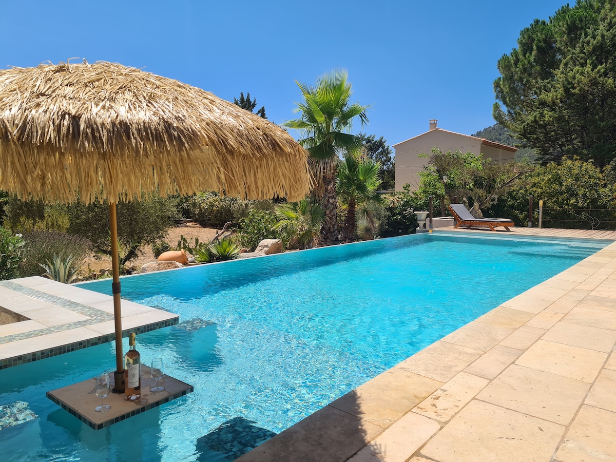 Cette élégante et discrète maison de 60 m2 plain-pied, composée d'une chambre, une salle d'eau avec toilette, une cuisine entièrement équipée ouverte sur la pièce de vie, un espace exotique de 15 m2 dédié aux joies du jacuzzi , une terrasse de 28 m2, donnant sur un jardin privatif et une place de parking privée, le tout entouré par la quiétude d'une pinède provençale à proximité d'un centre équestre et de criques sauvages, avec une situation idéale pour visiter la Provence et plus encore !