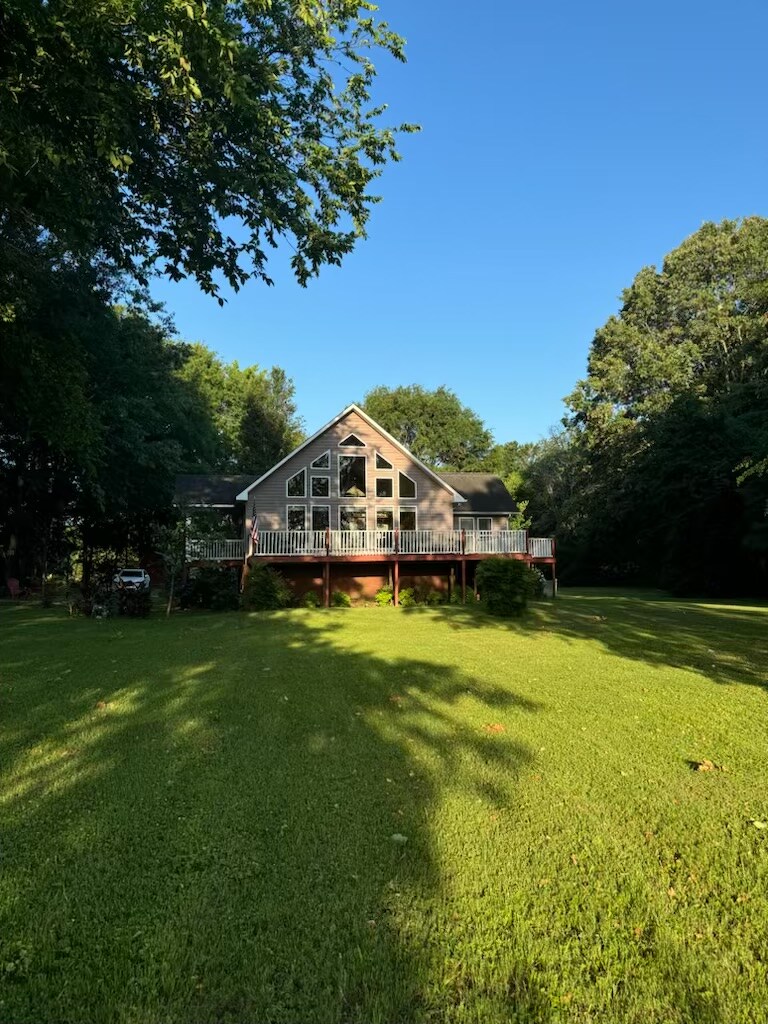 I designed this home to have 2 separate living spaces with private entrances on opposite sides of the house. The front is the vacation rental entrance accessing the entire first/lower level. My entrance is on the back side of the property. My family owns part of Lake Shore Island located on Guntersville Lake. There are 5 houses on our property scattered over 8 acres. My home and vacation rental is about 3 football fields from the shore, up the hill, providing beautiful views of the lake.