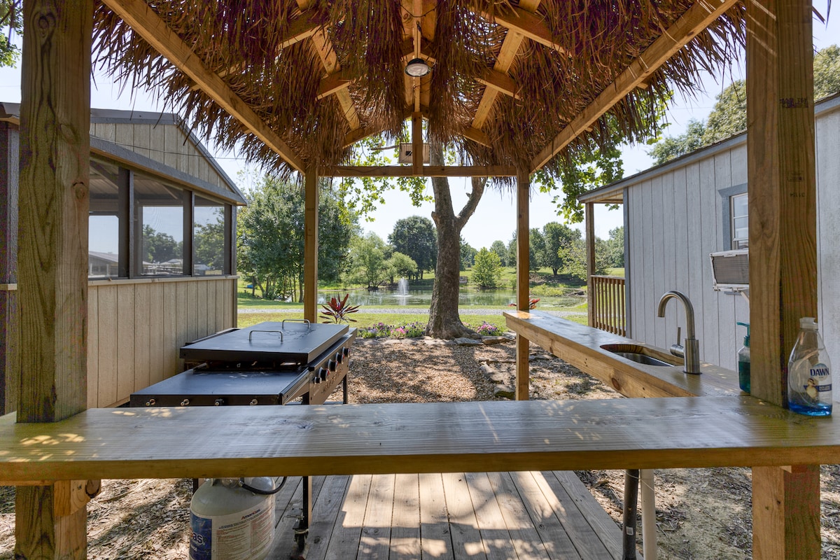 Take it easy at this unique and tranquil getaway. We offer a lot for the space in this 1 bed 1 bath private getaway. Enjoy sitting on the dock or relax in the screened in sitting room while listening to the water fountain. You will be on the premises where we run a Husky kennel and at times will hear the howling of the pack. Bring food to cook on the Blackstone grill at the outdoor kitchen. Storm shelter access for guest at the cabin.