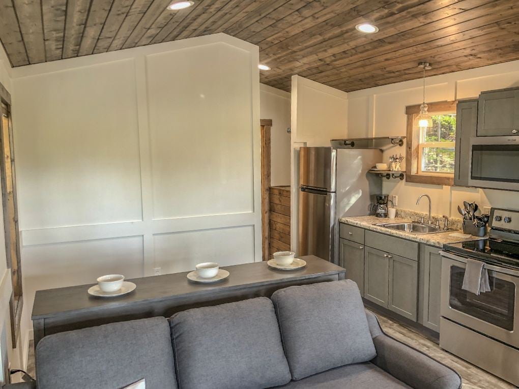Our modern cottage style cabins boast well-appointed accents like plush bedding, plenty of comfy seating, and more. The 14 x 29 foot Premier Cabins have a fully functional kitchen stocked with cookware, An oversize living room with full size sleeper sofa, a roomy two seat shower in the full bathroom, a queen bed in the master bedroom, as well as a covered porch perfect for sipping your morning coffee. A $45 per pet (1) cleaning fee is added to this listing. Please message me to adjust.