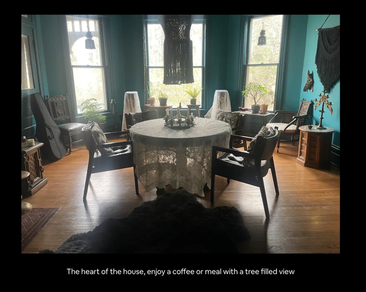 Hands down the most unique Victorian, art-filled experience in Illinois. Housing a private art collection, the “glamping” themed bedroom puts you near Starved Rock, but in your own historic oasis. The dog friendly space has a serene fenced in back yard, while the inside boasts a private office, a salon/piano room, a yoga studio, private rehabbed bathroom and dining room you have to see to believe. Built in 1896, enjoy the Victorian Charm, with all the added modern convenience.