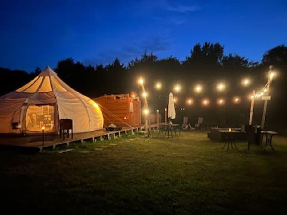 If you are looking for a unique romantic escape or potentially a girls trip, this sky-gazing lotus bell glamping experience is calling your name. Cuddle up by a camp fire while enjoying the soothing sounds of nature. Evade the hustle and bustle of every day life and embrace the serenity that surrounds you. Unwind in your private bubbling Salu Spa hot tub. Some additional features include a portable heater, air conditioning, fan, queen bed, stocked coffee bar, mini refrigerator & hot tub.