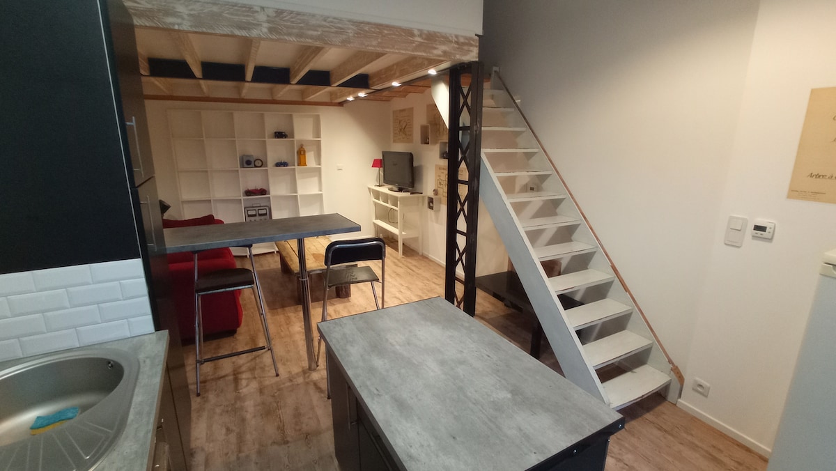 Logement de 35 m² réalisé dans une ambiance industriel, acier, brique. totalement indépendant , avec jardin,pour vous prélasser, vous pourrez aussi y déposer vos vélos en toute sécurité . La voiture quant à elle pourra être stationnée sous la fenêtre de la chambre. Le logement n'est pas adapté aux personnes à la mobilité réduite (présence d'un escalier)