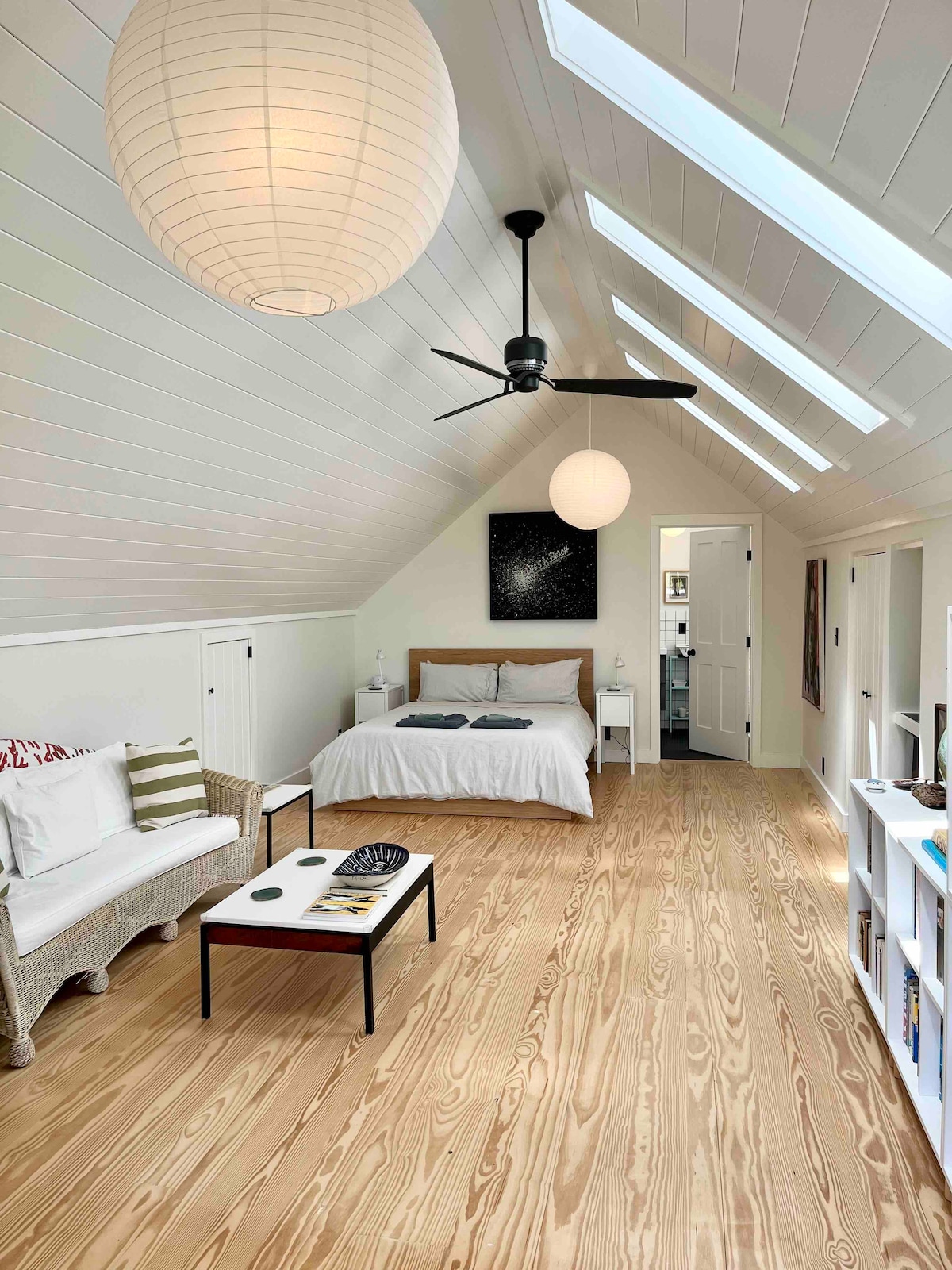 A beautiful guest suite on Martha’s Vineyard with a private entrance on the 2nd floor of the back wing of our newly renovated modern barn house. Surrounded by trees, beside a large meadow, this large 400 square foot suite has vaulted wood ceilings and skylights. Enjoy the outdoor shower and new outdoor sitting area. The location is centrally located, just off historic Music St, a short walk to a small town center which provides amenities. Ask about our other guest suite if you are with others.