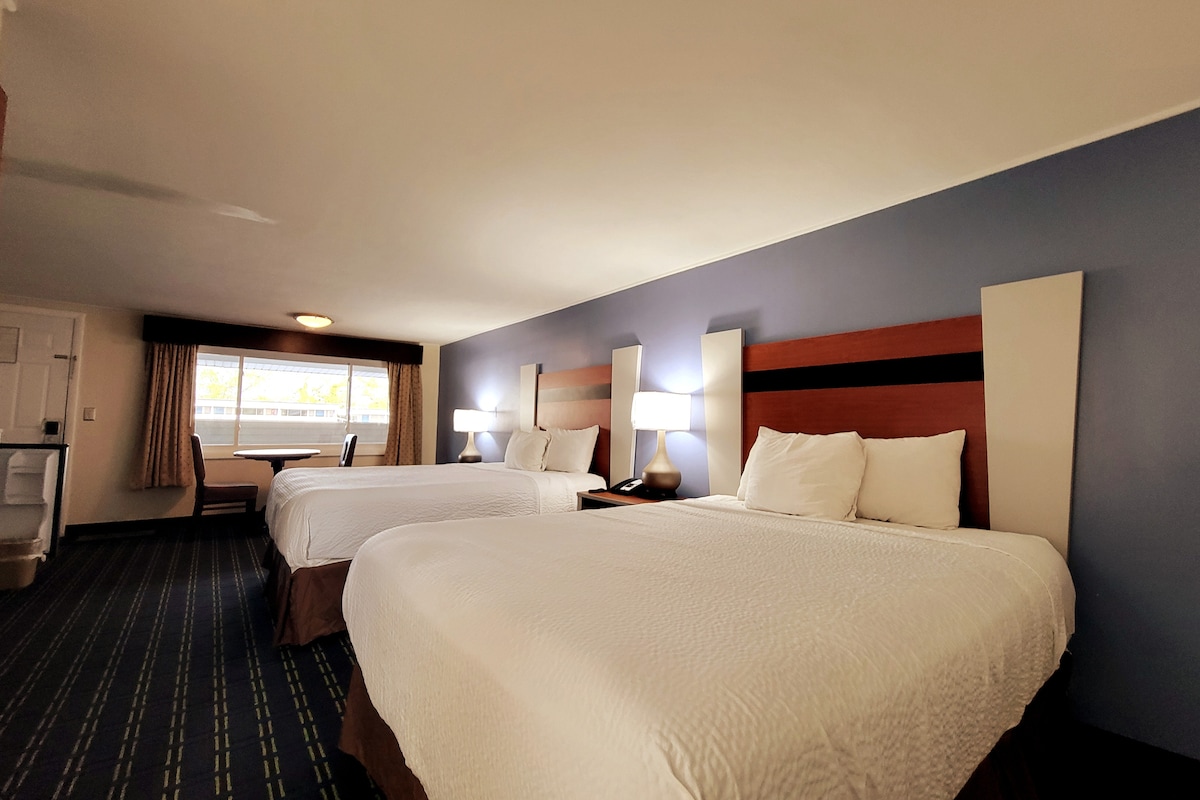 Cozy and budget-friendly, our tastefully appointed rooms are perfect for travelers seeking comfort and value. Conveniently located on the first floor, each room features two double beds and an activity table with chairs—making it easy to relax or get a little work done during your stay!
