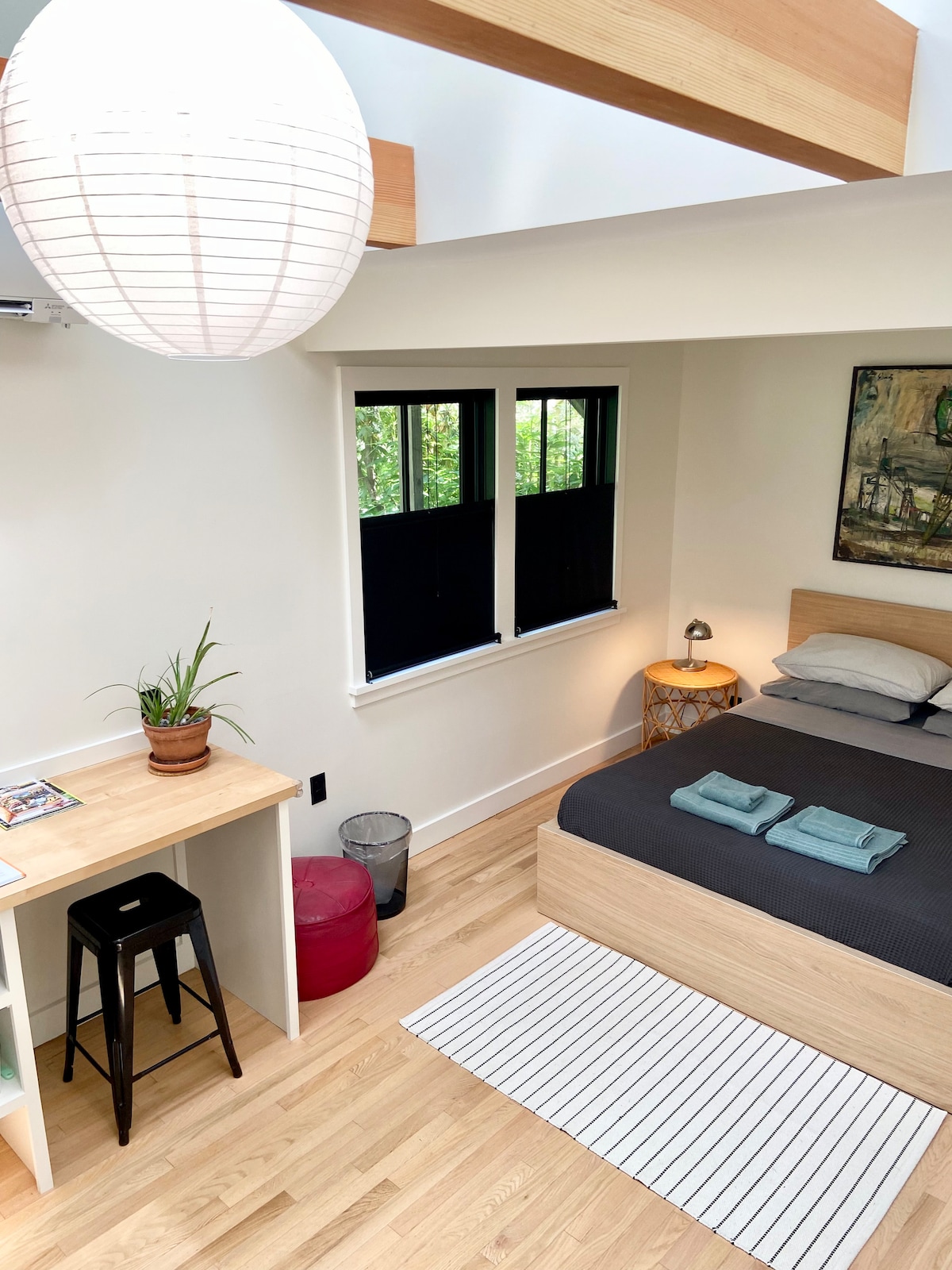 A beautiful guest suite on Martha’s Vineyard with a private entrance on the back wing of our newly renovated modern barn house. Surrounded by trees, beside a large meadow, this airy suite has vaulted wood ceilings with skylights. Enjoy the outdoor shower and new outdoor sitting area. The location is prime and centrally located, just off historic Music St, a short walk to our small town center which provides many amenities. Ask about our other private guest suite if you are traveling with others