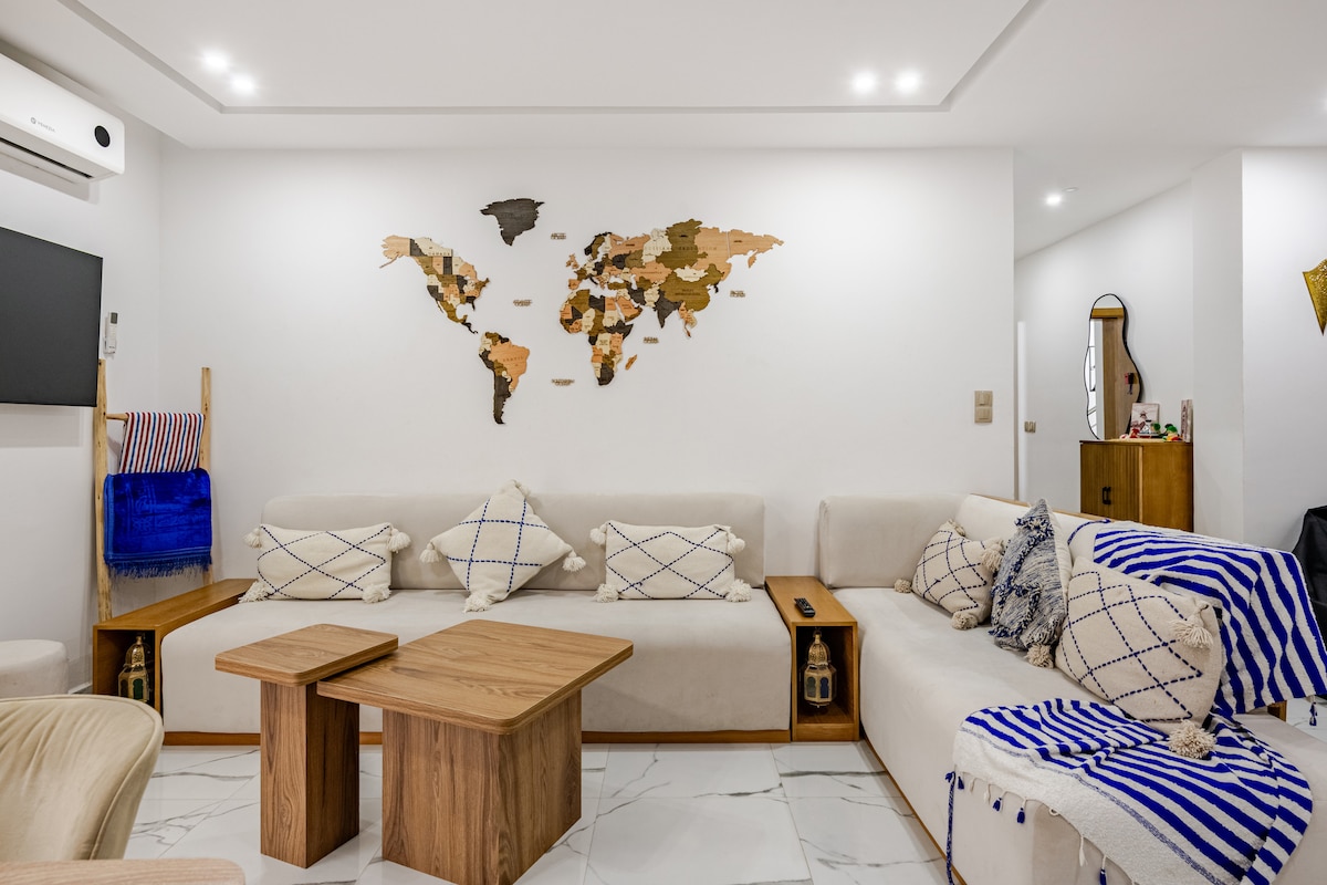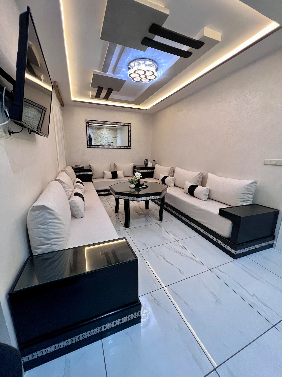 ✨L'appartement Panoramique à les jardins bleus se caractérise par son design à la fois moderne et élégant, chaque élément étant soigneusement conçu pour vous garantir une expérience sans pareille ✨Son emplacement central ✅ Appartement avec vue panoramique sur la mer et à proximité de : ✅ 1 min de la plage de Martil 🏖 et sa fameuses corniche ✅ 5 min de la Plage de Cabo Negro 🏝 ✅ 4 min de Ikea et KFC 🍗 ✅ 6 min de Marjane et McDonald's 🍟 ✅ 1 min restaurants cafés, commerces