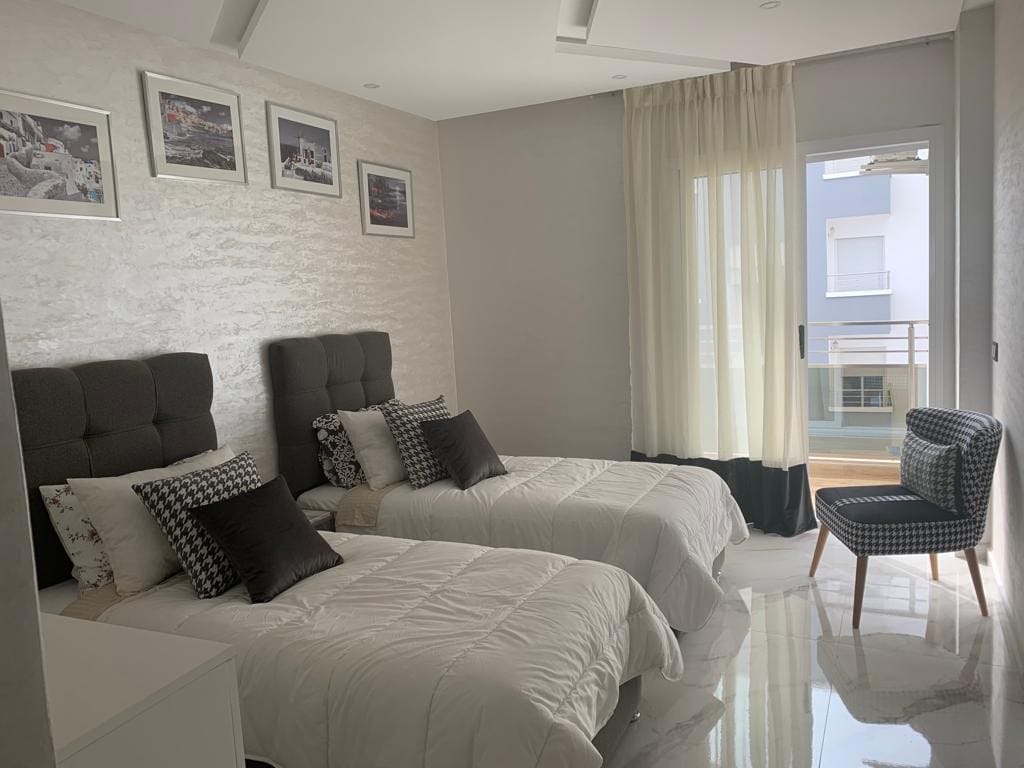 bel appartement élégant, bien entretenu, style àméricain, 2 chambres, une chambre adulte avec petit balcon, une autre à deux lits avec balcon ouvert sur la façade, contenant une table à café. un séjour ouvert sur la cuisine. il y en a deux salles de bain,un ds la chambre à coucher pr adultes. appartement équipé, la résidence est proche de ts les services, ( avenue mohamed 5, près de café aji dou9) . ascensseur, camera et espace à égarer. 5 min à la plage par auto, 20 min a pieds.