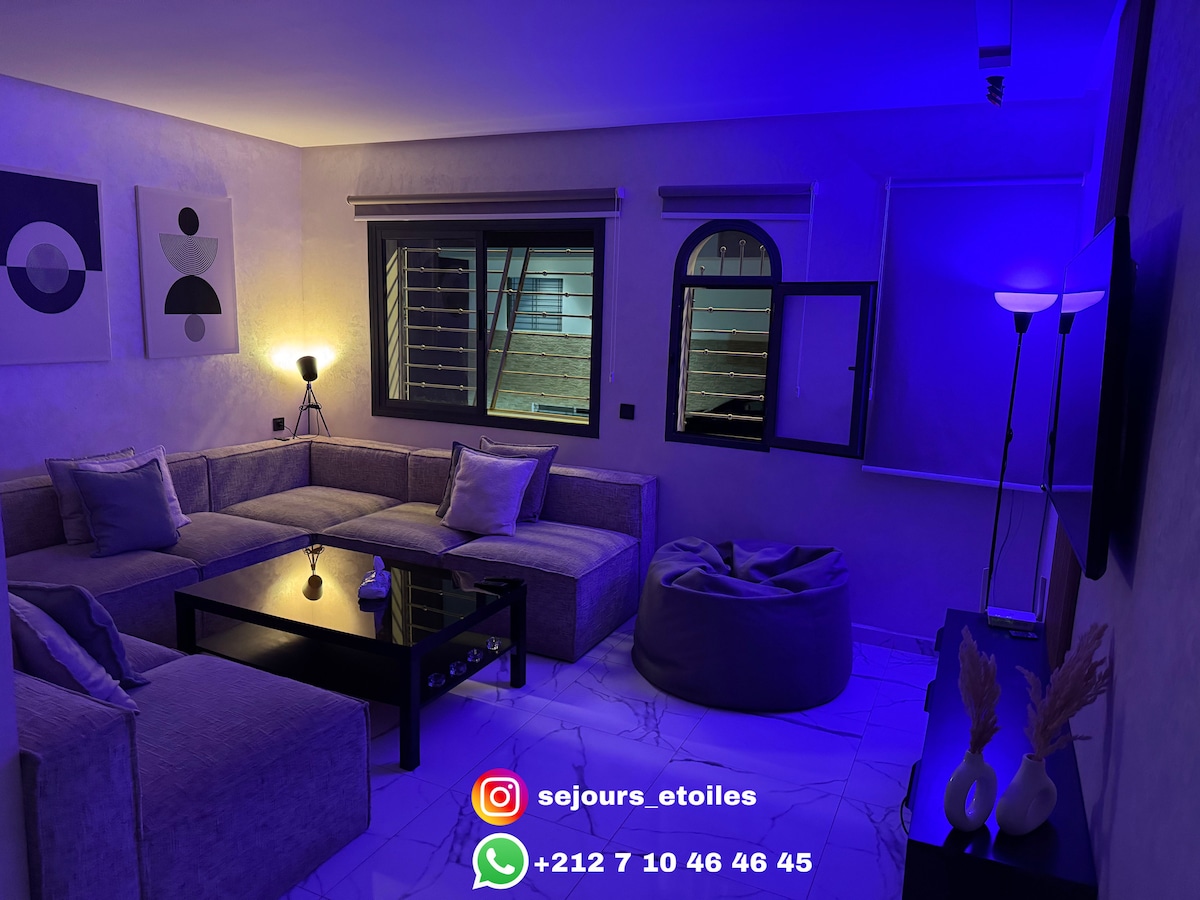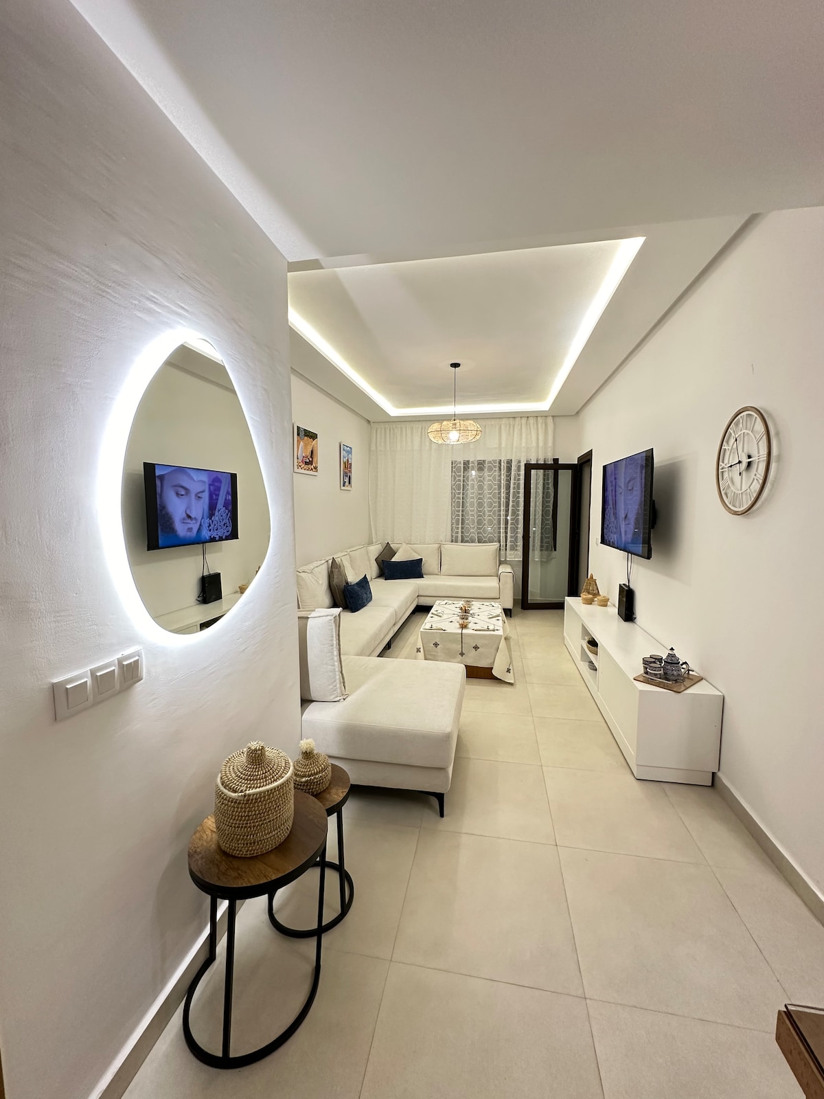 ✨L'appartement Panoramique à les jardins bleus se caractérise par son design à la fois moderne et élégant, chaque élément étant soigneusement conçu pour vous garantir une expérience sans pareille ✨Son emplacement central ✅ Appartement avec vue panoramique sur la mer et à proximité de : ✅ 1 min de la plage de Martil 🏖 et sa fameuses corniche ✅ 5 min de la Plage de Cabo Negro 🏝 ✅ 4 min de Ikea et KFC 🍗 ✅ 6 min de Marjane et McDonald's 🍟 ✅ 1 min restaurants cafés, commerces