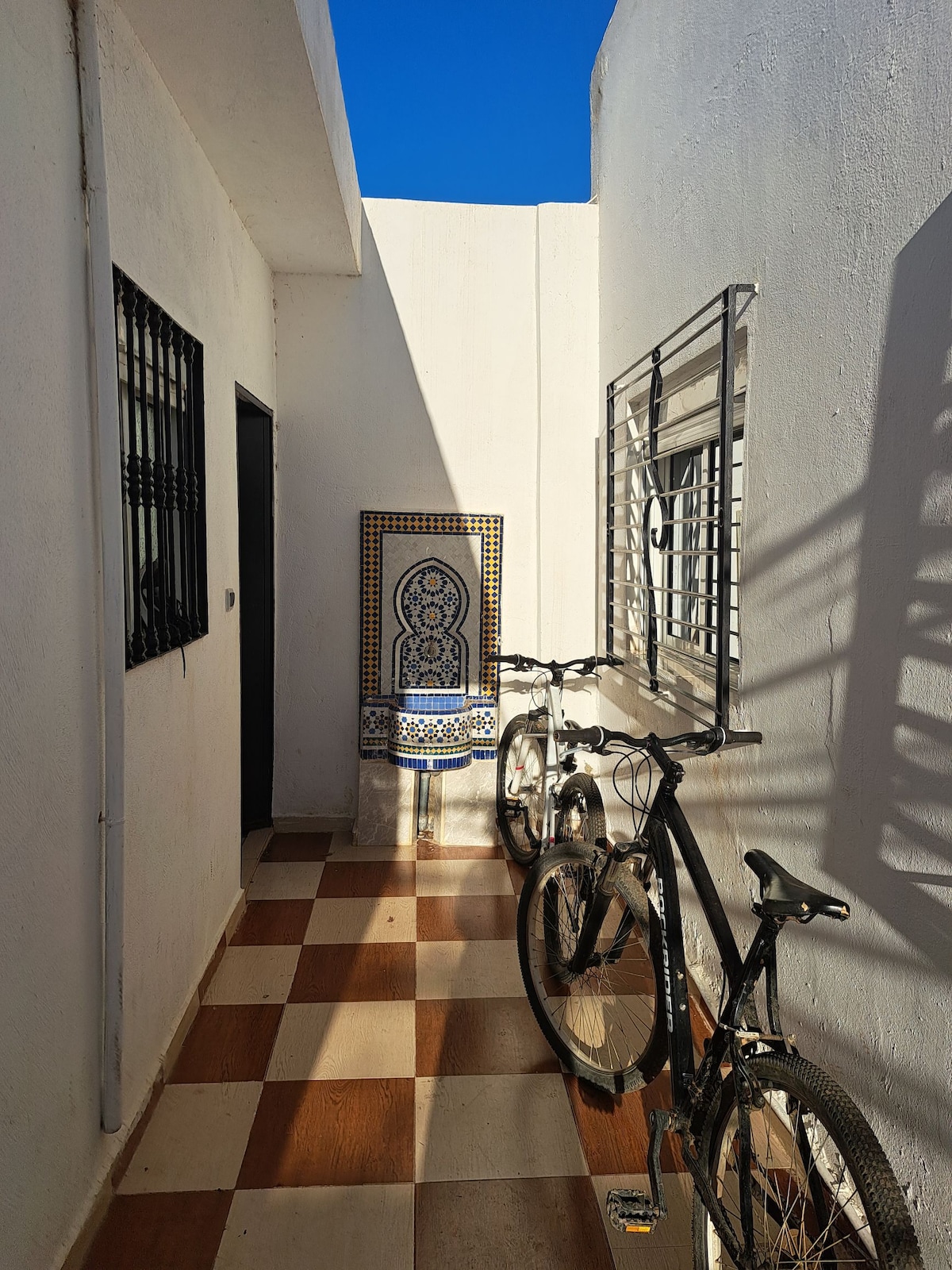 Bonito Riad junto una de las puertas principales de acceso a la medina. Casa amplia y con una gran terraza. A nivel de calle, entrada, cocina, baño , Salón, comedor y saloncito. En el primer piso habitación doble con camas individuales, aseo y habitación triple com cama de matrimonio y cama individual. en el segundo piso una gran terraza con vista a la medina y las montañas. Parking vigilado gratuito al lado de la puerta de la Medina. Si podemos te recibiremos a cualquier hora, pregúntanos