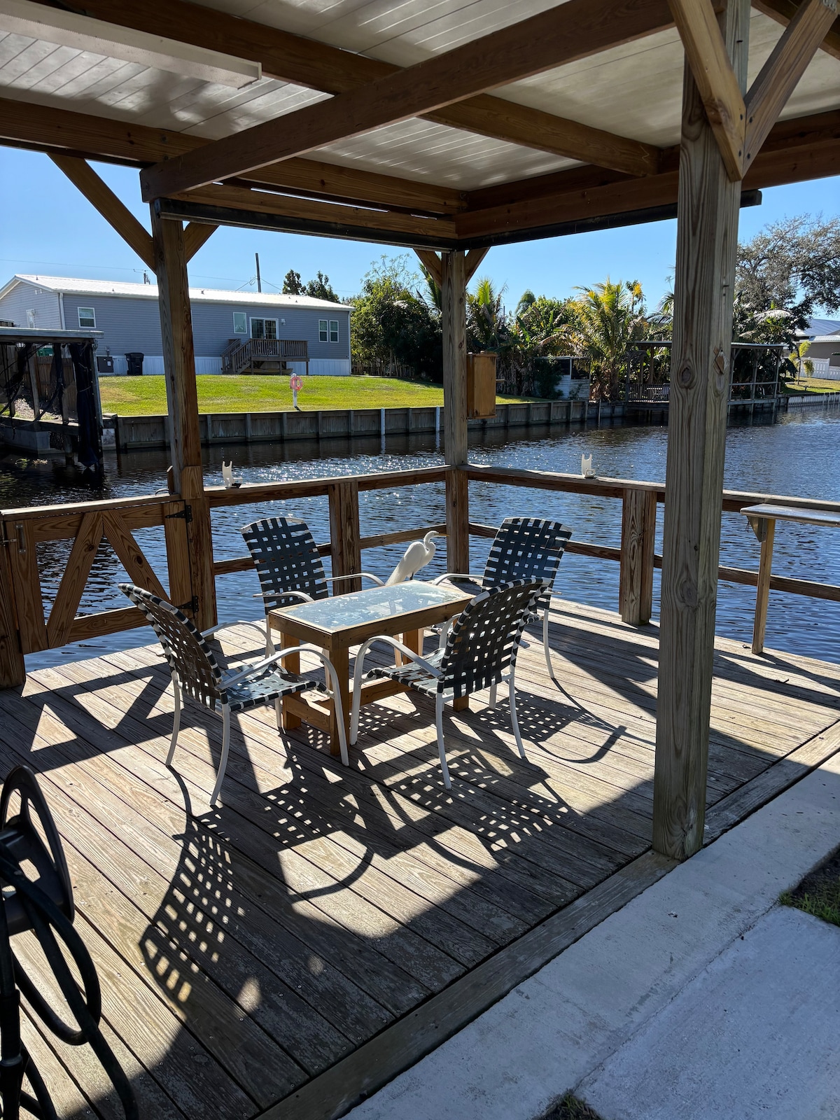 Private waterfront sanctuary w/ dock, tiki, hot tub, pool & yard. Comfy, spacious area to kick back & relax. A natural preserve area showcases beautiful birds & wildlife. We have 7 kayaks. Boaters can dock boat & cruise to the ocean or downtown Stuart without any fixed bridges. We also offer 2 bikes. Cabin-like feel but w/ hurricane impact windows & doors, new floors, shower, vanity, kitchen countertop, & tiki hut. Two large hammocks & firepit. All the amenities of home but feels like paradise.