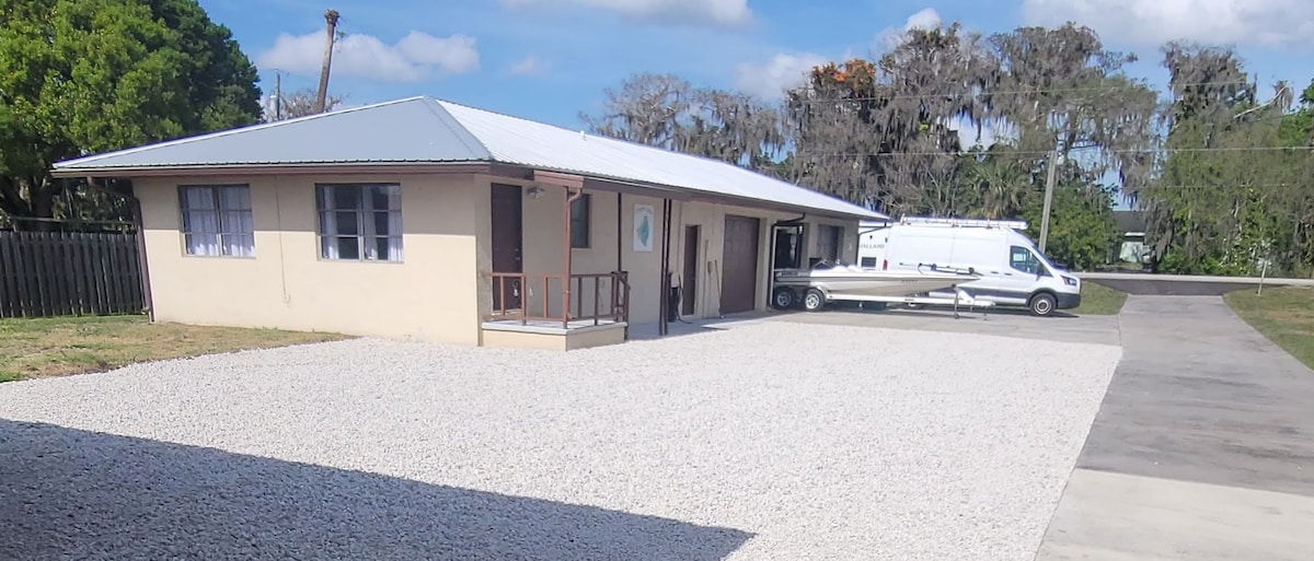 Enjoy the river. Bring your boat, launch down the street and place it on our boat lift during your stay. Have fun with the whole family in this newly updated cottage. Updates include, new kitchen, appliances, flooring, vanities, mattresses, furniture. Come and stay at our St Lucie River Cottage. Lounge in the sun on our deck or kayak down the river to see wildlife up close and lovely homes along the river. Some traffic noise may be observed. Only small dogs may be approved. Fee of $250.