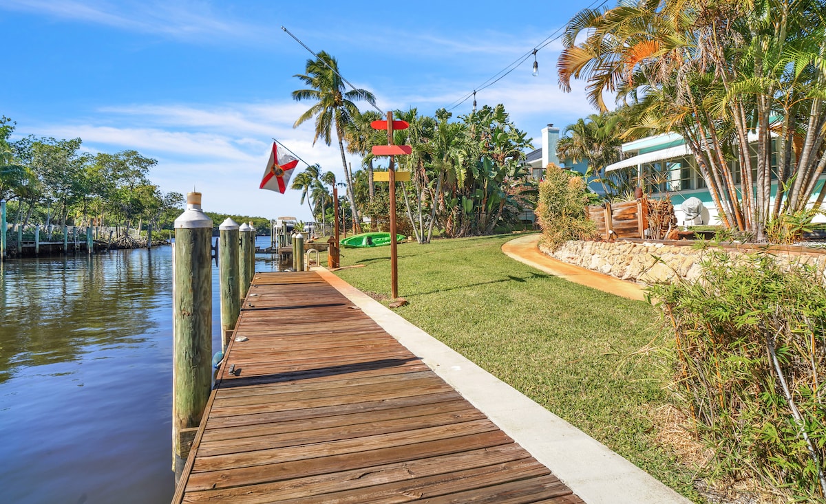 Private waterfront sanctuary w/ dock, tiki, hot tub, pool & yard. Comfy, spacious area to kick back & relax. A natural preserve area showcases beautiful birds & wildlife. We have 7 kayaks. Boaters can dock boat & cruise to the ocean or downtown Stuart without any fixed bridges. We also offer 2 bikes. Cabin-like feel but w/ hurricane impact windows & doors, new floors, shower, vanity, kitchen countertop, & tiki hut. Two large hammocks & firepit. All the amenities of home but feels like paradise.