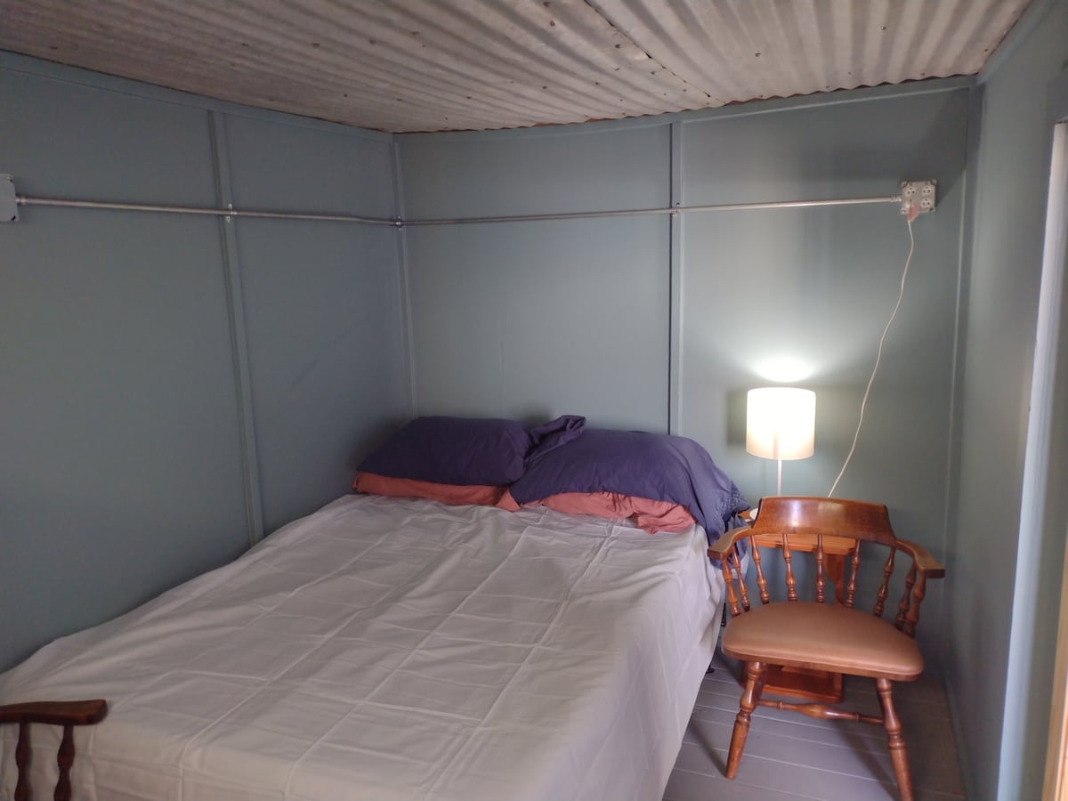 Bed at Hook Hand Brewery. Old walk in cooler on side of brewery. Converted into room with full size bed, smart tv NO wifi, ac/heat, lights, chairs, fan, porch. Bathroom with just toilet and sink with cold water about 100 foot walk away. Brewery open Fri and Sat 4-9pm maybe later. WARNING short door, old steps, unlevel ground.