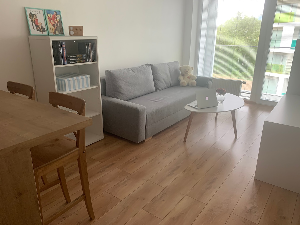 Užite si Váš pobyt z tohto výborne situovaného miesta. Minútu od bytu sa nachádza celá občianska vybavenosť. Centrum je vzdialené 4 minúty autom, a 15 minút peši. Ide o 1 izbový byt so samostatnou kuchyňou. Bytík disponuje rozkladacou sedačkou s vlastným matracom o veľkosti 140x200 cm. Po dohode je k dispozícii aj detská postieľka.