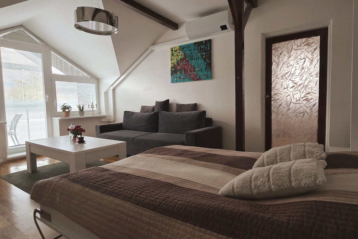 Apartmán, ktorý Vám určite poskytne všetko, čo budete k pohodlnému pobytu potrebovať. Apartmán má veľkú spálňu, obývačku s rozkladacou sedačkou, balkón a plne vybavenú kuchyňu. Nachádza sa v strategicky výbornej lokalite, odkiaľ je to autom len chvíľka do centra mesta Martin a tiež do mesta Vrútky. Na prízemí obytnej budovy sú potraviny, v blízkosti kompletná občianska vybavenosť, Tesco, Lidl, autobusová aj železničná stanica.