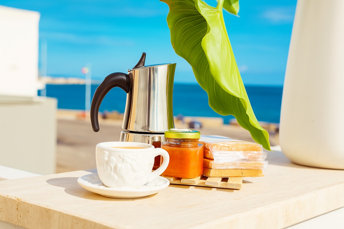 Stunning renovated spacious luxury one bedroom 2nd floor apartment 55 m2, with high ceilings, stone floors and panoramic rooftop terrace with exceptional views of the town and sea in quiet and location. The spacious bedroom has a king size bed with a quality 22 cm mattress ( 180 x 200 ) and private balcony. The sitting room has a small winter kitchen with hob and a small fridge. The rooftop kitchen is fully equipped on the upper level accessible with a staircase.Casa Mima in same building