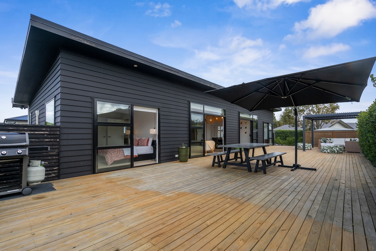 Architecturally designed Balinese inspired “modern barn” in Pinot Grove, 900m from the town centre. Set in a quiet cul-de-sac, this bespoke 3 bedroom & dedicated study/gamers /kids room holiday home is perfect for families with teens, professionals, writers, wedding groups and couples. Complete with a chef’s kitchen, full house heating and air conditioning for all year comfort, gas fireplace, hyper-fibre internet, spa & outdoor living with BBQ. Enjoy the community swimming pool, tennis & more.