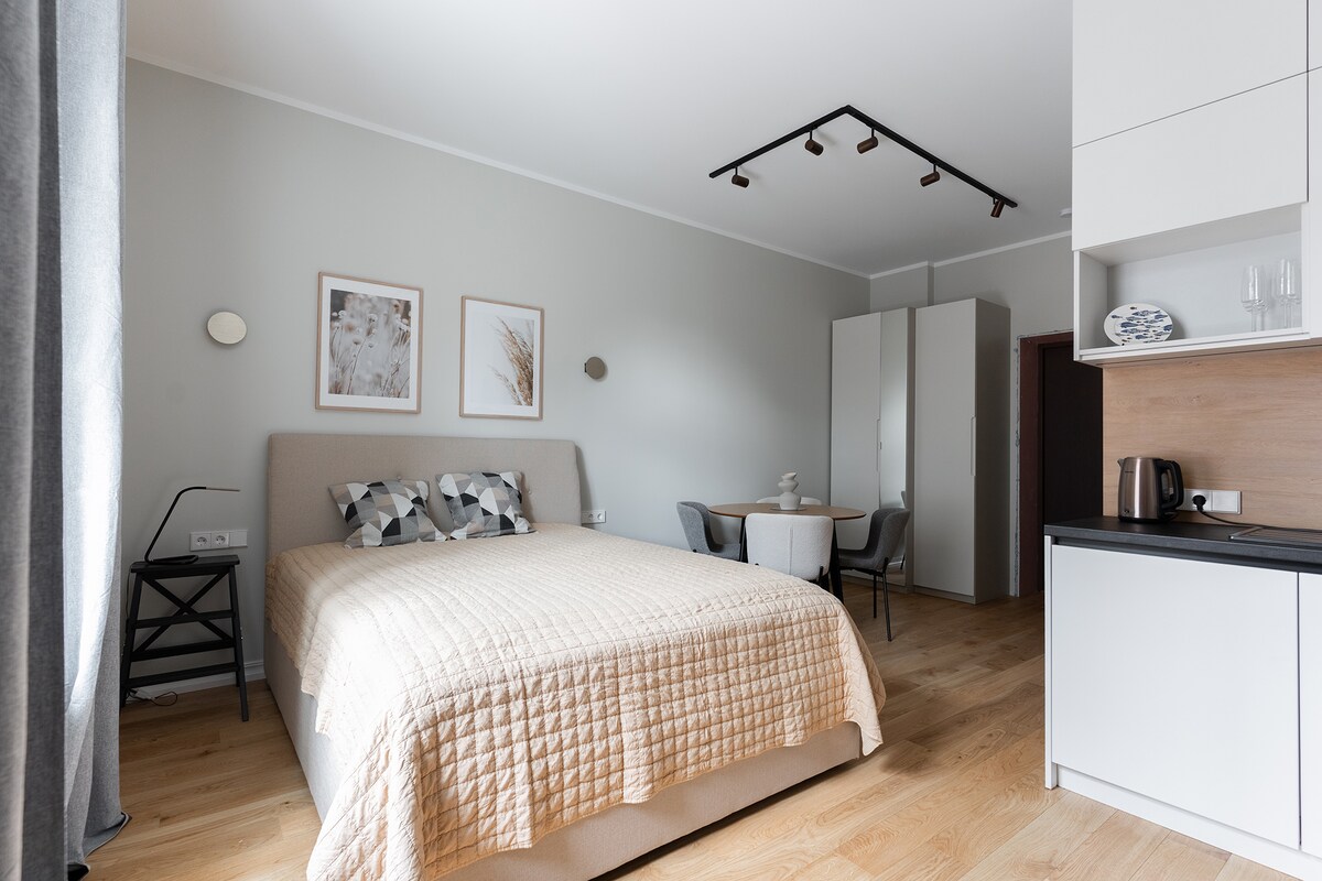 Very sunny and comfortable, newly renovated, 1-bedroom apartment designed by a renowned Dutch interior designer. Perfect as a romantic getaway for couples or all-you-need comfortable stay with children. The apartment is in a beautiful location - only a stone’s throw away from the Daugava river and 5 minutes from the center by car. A perfect springboard to discover either Riga or the surroundings. Included in the rent is a private parking space within the fenced property and 2 bicycles available