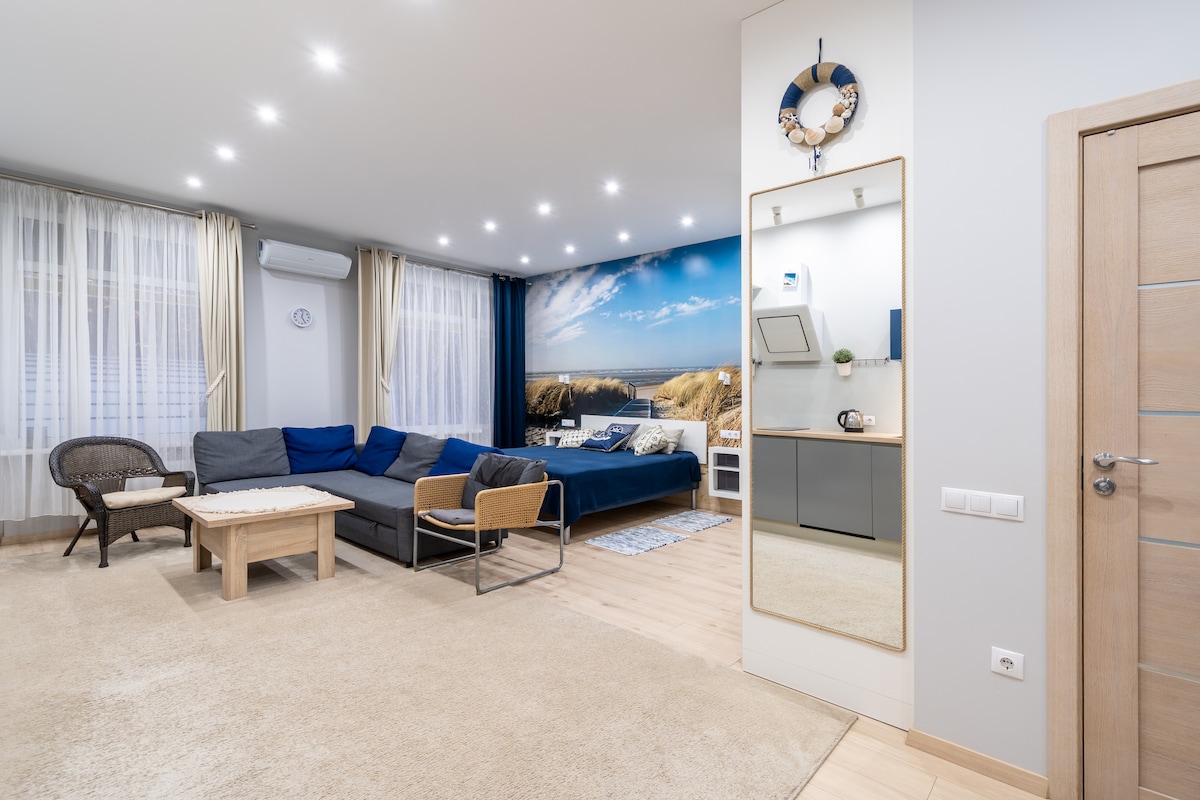 Stylish studio with private garden & terrace just 100m from the sea. Perfect for couples or families (sleeps 4). Enjoy a peaceful stay with a fully equipped kitchen, fast Wi-Fi, Smart TV and private parking. Located near Dzintari Beach, restaurants and the forest park. Ideal for beach lovers and those seeking comfort and privacy in the heart of Jurmala.