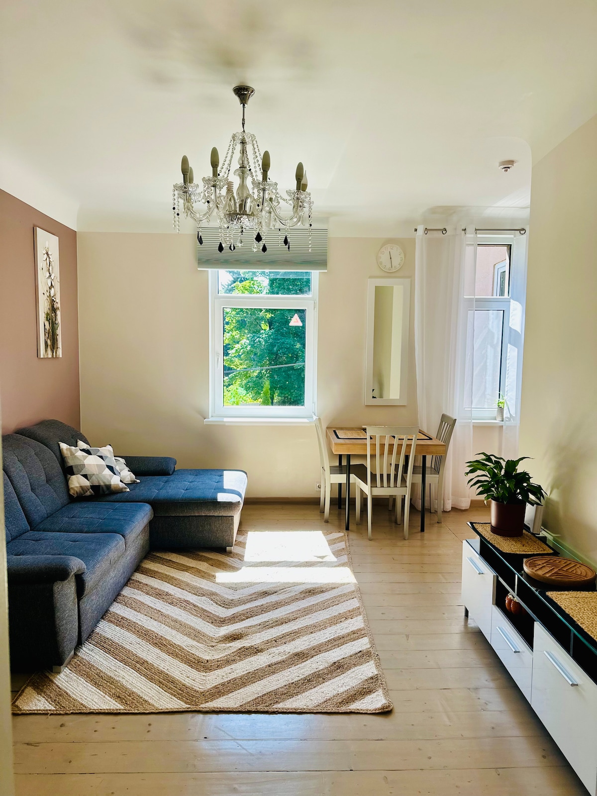 Very sunny and comfortable, newly renovated, 1-bedroom apartment designed by a renowned Dutch interior designer. Perfect as a romantic getaway for couples or all-you-need comfortable stay with children. The apartment is in a beautiful location - only a stone’s throw away from the Daugava river and 5 minutes from the center by car. A perfect springboard to discover either Riga or the surroundings. Included in the rent is a private parking space within the fenced property and 2 bicycles available