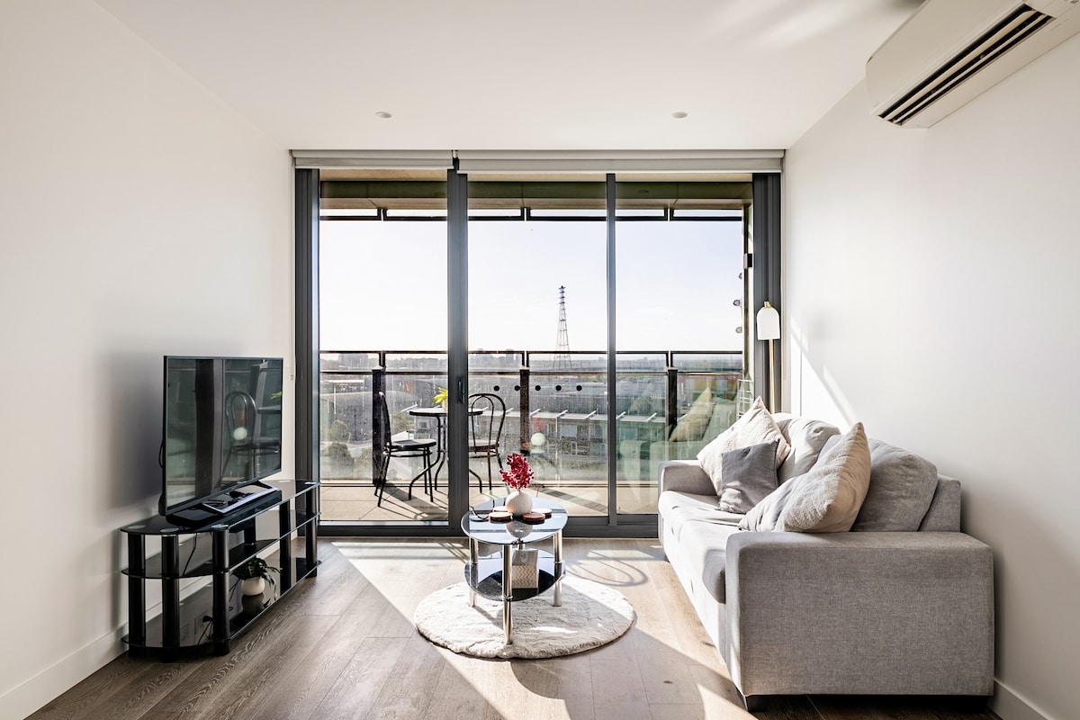 Perched high above the city, this beautifully styled apartment offers sweeping skyline views, a plush queen bed, a fully equipped kitchen, a Nespresso machine for your morning ritual, high-speed Wi-Fi, a private balcony to unwind, and a small welcome treat to make you feel right at home. Just steps from restaurants, Crown, Marvel Stadium, and Southern Cross Station. SkyBus, trains, and trams are all right at your doorstep. Early check-in or late check-out available upon request — please ask