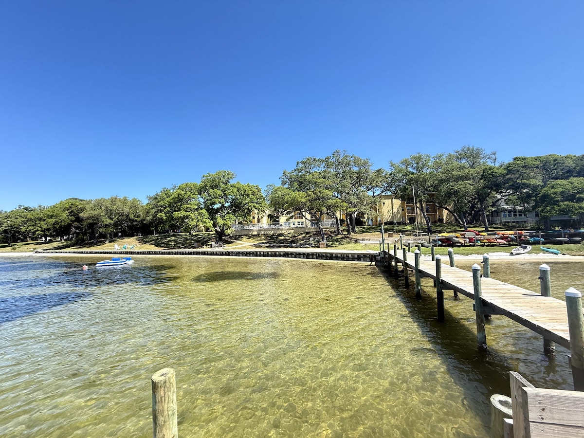 Welcome to The Salty Pirate, your waterfront vacation paradise! Kick back & relax in our calm, stylish condo featuring a king size bed, luxury bathroom & kitchenette. Relax in bed, enjoy the boats cruise by or watch the 65 inch TV. The waterfront balcony entices you to read & relax. Enjoy the resort style pool or reserve the 2-seater kayak (when available) provided for you to explore the waterway. Downtown restaurants & bars are walking distance & the white sugar sand beaches are 2 miles away!