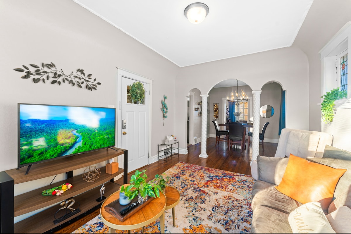 Bring the whole family to this great place with lots of room for fun. This darling home is in Midtown St. Charles in the Historic District and sleeps 11. Updated, fully stocked kitchen with Keurig coffee bar, dining room, 2 living rooms, 4 large smart TVs, 5 bedrooms, 2 full bathrooms, washer & dryer, outdoor patio with furniture, fire pit, and dining area, street & garage parking. Close to area attractions: Historic Main Street, Ameristar Casino, Katy Trail, & Lindenwood University.