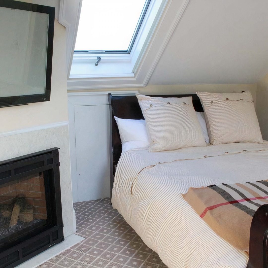 The Sunlit Suite is our largest accommodation and features beautiful views of the farm. It includes a queen bed, fireplace, a semi-private room with a pull-out sofa bed and fireplace. Amenities include: 600 square feet of space Furnished kitchenette Two gas fireplaces Sitting room Shower and separate vanity, heated bathroom floors Hairdryer and toiletries WiFi and two TVs Our Sunlit Suite is located on the attic level and is only accessed by the stairs.