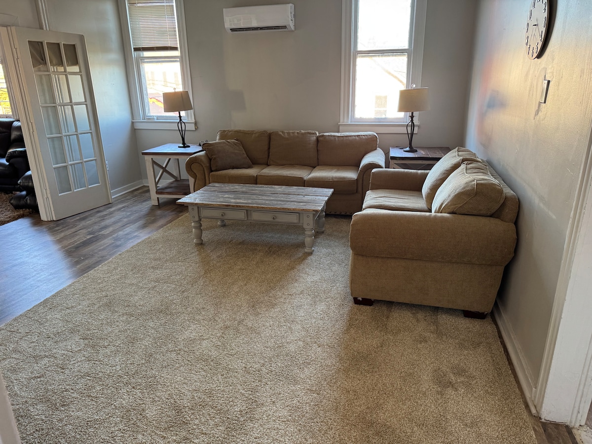 This beautiful loft apartment is right in the center of downtown Brunswick! The apartment offers a queen bed on the main floor and two twin beds in the loft. There is a small section sofa that can be used for an additional sleeping space. The apartment offers a fully equipped kitchen with a stove, oven, microwave and refrigerator along with a washer and dryer. There is wifi and a Smart TV, which is on a swivel mount so you can watch your favorite streaming services from the couch or the bed.