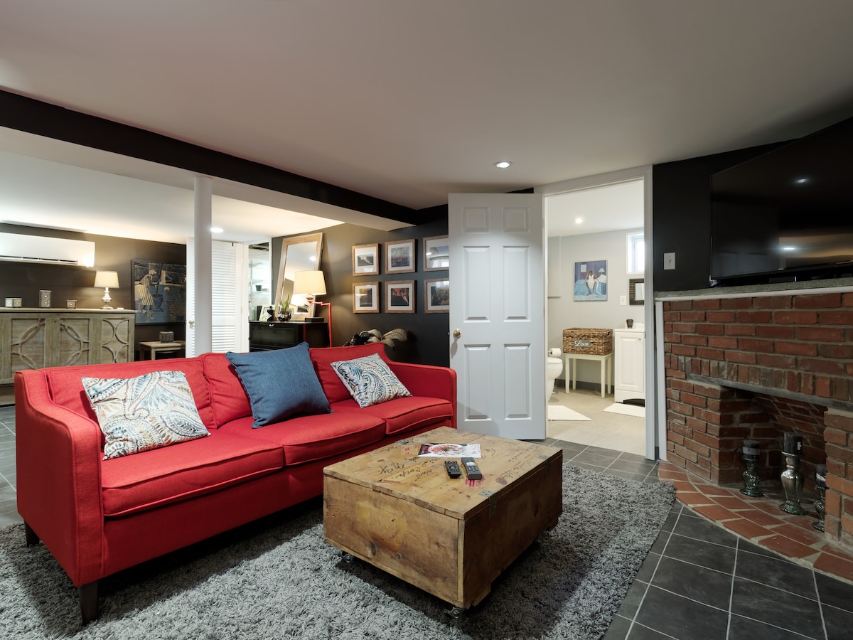 Clean private walkout basement apartment with private bedroom (queen bed); plus folding twin bed for third guest, private full bathroom; kitchenette equipped with a fridge, Keurig coffee maker, cook-top, boiler, microwave, and toaster; spacious living room with fireplace equipped with TV (Netflix) and free WiFi. Dining table with two chairs. Basic kitchen utensils and silverware. Workspace: desk, swivel chair. The entrance path is sloping, may be difficult for guests with mobility challenges.