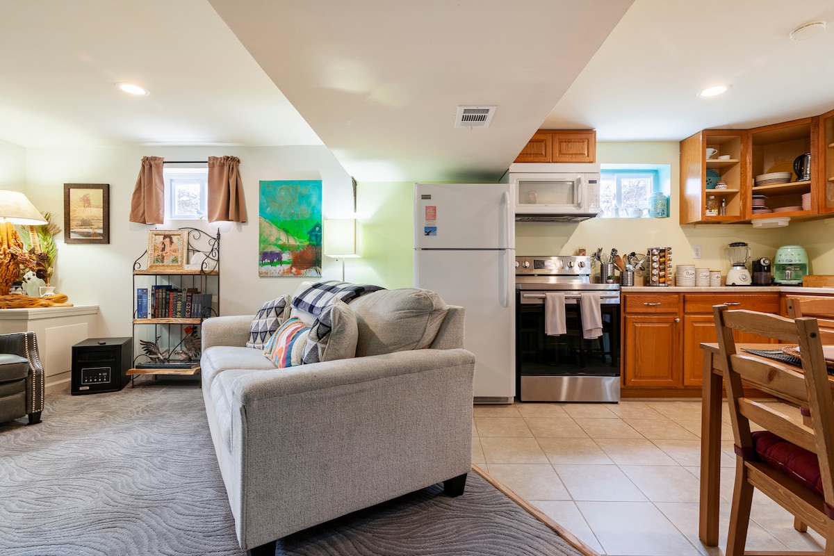 This apartment with its own private entrance sits below our brick Cape Cod-style home. The unit is totally refurbished with luxury amenities. It's a cozy bohemian cottage vibe with a touch of Miyazaki anime magic. Open floorplan includes a fully stocked kitchen with dishwasher (and new Nespresso!) plus a separate sleeping room with comfy king-sized bed and a private bathroom with a large walk-in shower. Off-street parking, fast internet, & sofa bed for extra guests. No smoking inside, please.