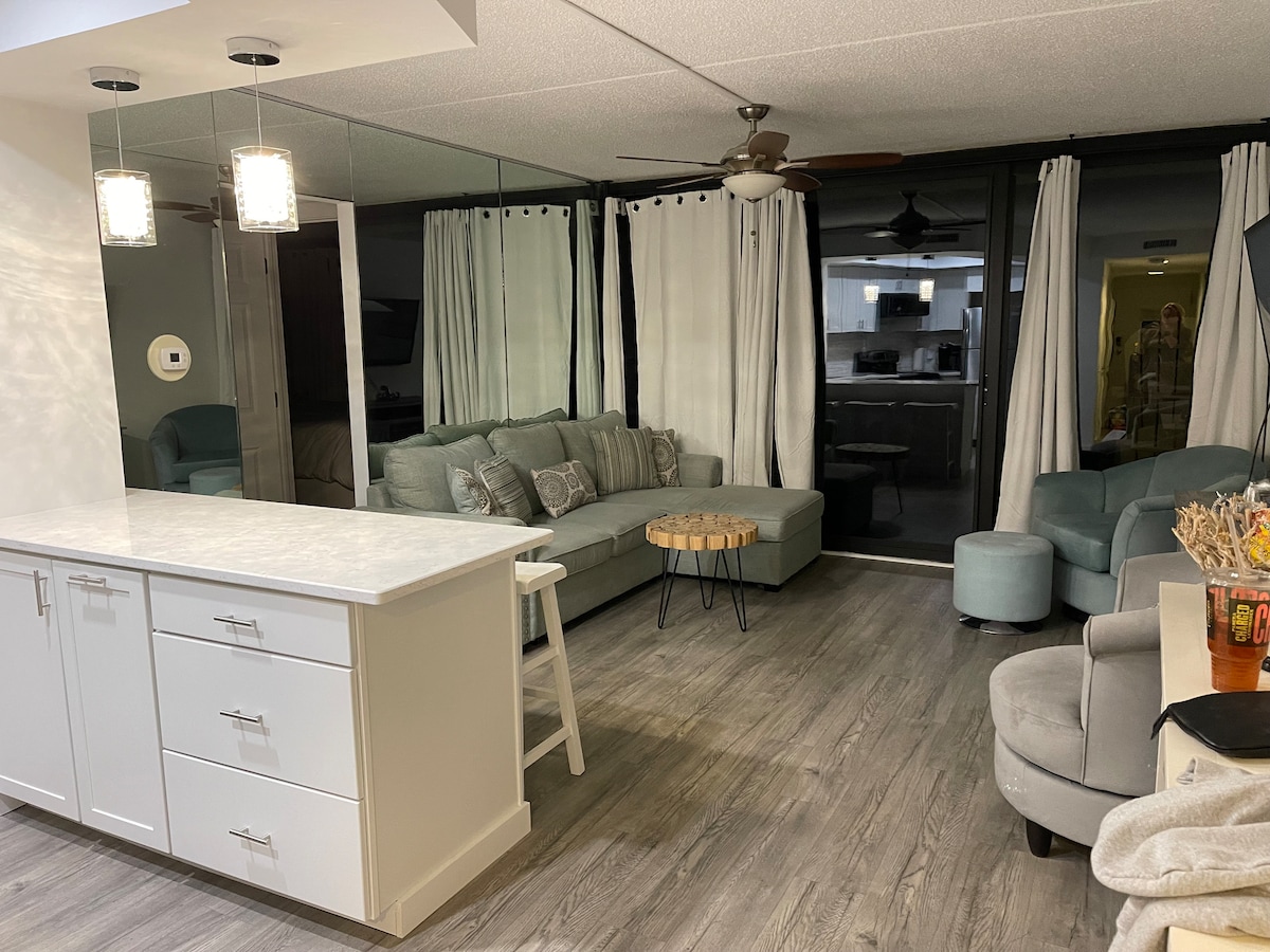Note: Must be 25 or older to rent our home. Beautifully renovated 2 bedroom beach front condo with views of both the beach and bay. Enjoy watching the waves roll in or a stunning sunrise through floor to ceiling windows without ever getting out of your king size bed. In the evening, open your front door to witness breathtaking sunsets over the bay. Or just relax with a drink on the beachfront balcony and listen to the waves with full 100% view of the beach and ocean.