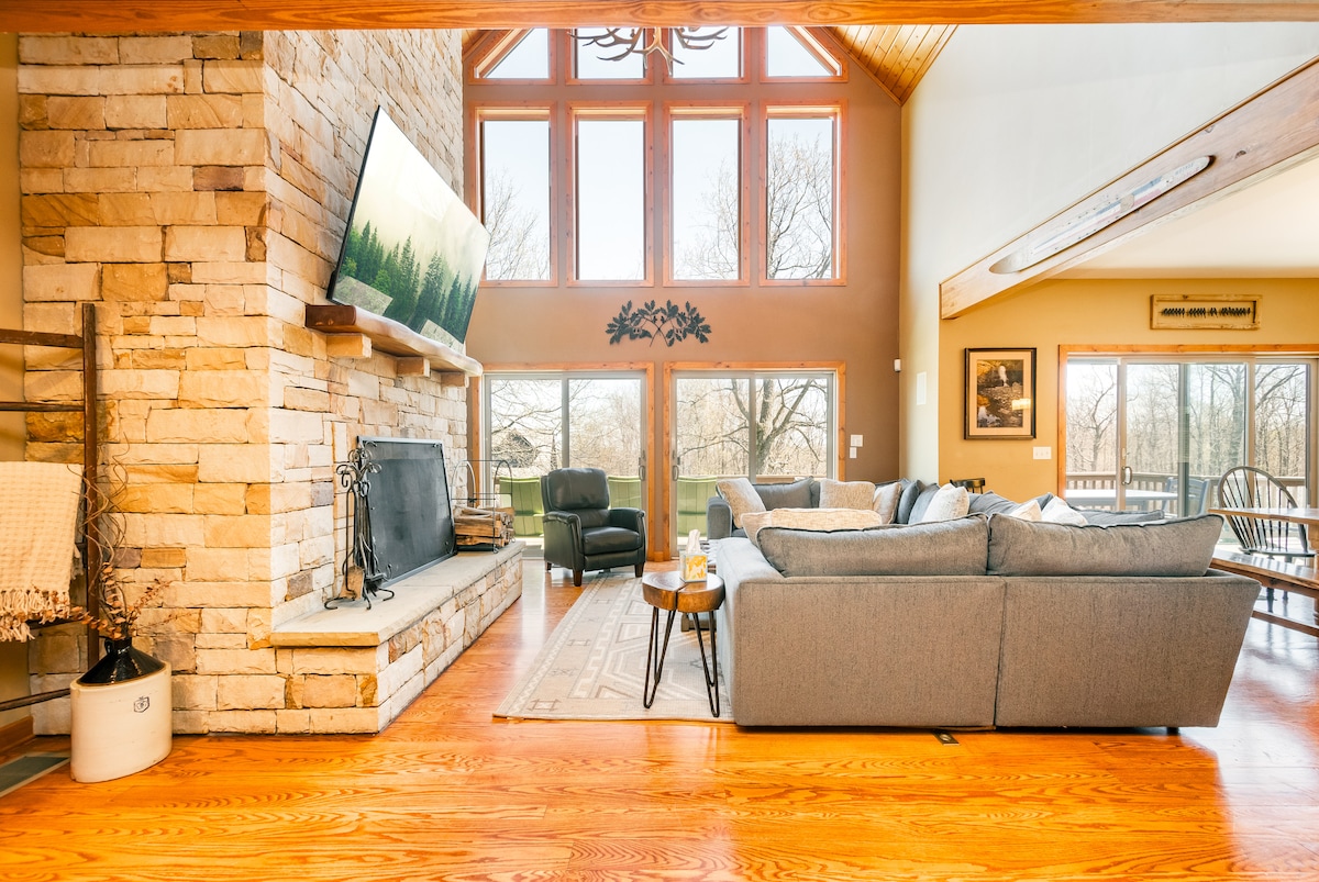 This home has a private dock, custom tiki bar, a beautiful private unobstructed view of the lake, multiple porch swings, smart tv outside in the tiki bar and 2 inside, comfortable poly furniture on the wrap around porch and around the fire pit, gas grill, hot tub, large flat front yard, and parking for 4 vehicles. Your guests will have no problem creating memories and before you leave you will be planning your annual return stay. Enjoy it like it is yours & bring your pups if you would like.