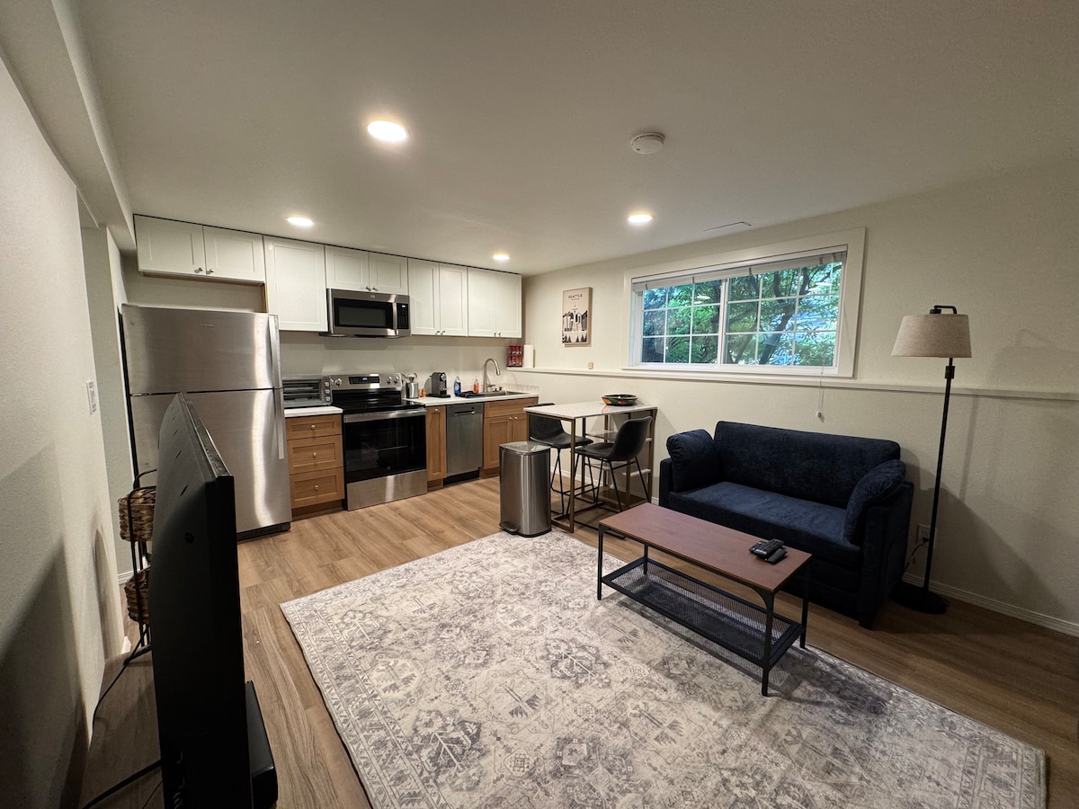 New Construction 1 bed apartment in Downtown Kirkland! Custom cabinets, quartz counters & stainless appliances! Beautiful salvaged & refinished fir flooring. Adorable bath w/ basket weave tile & soapstone counter! Private washer & dryer. WIFI & Smart TV. Vaulted ceilings, skylights & AC! This completely separate & private new construction apartment was completed in 2020 and is located above our detached garage. Perfect for short or long term stays. Live in the heart of Kirkland!