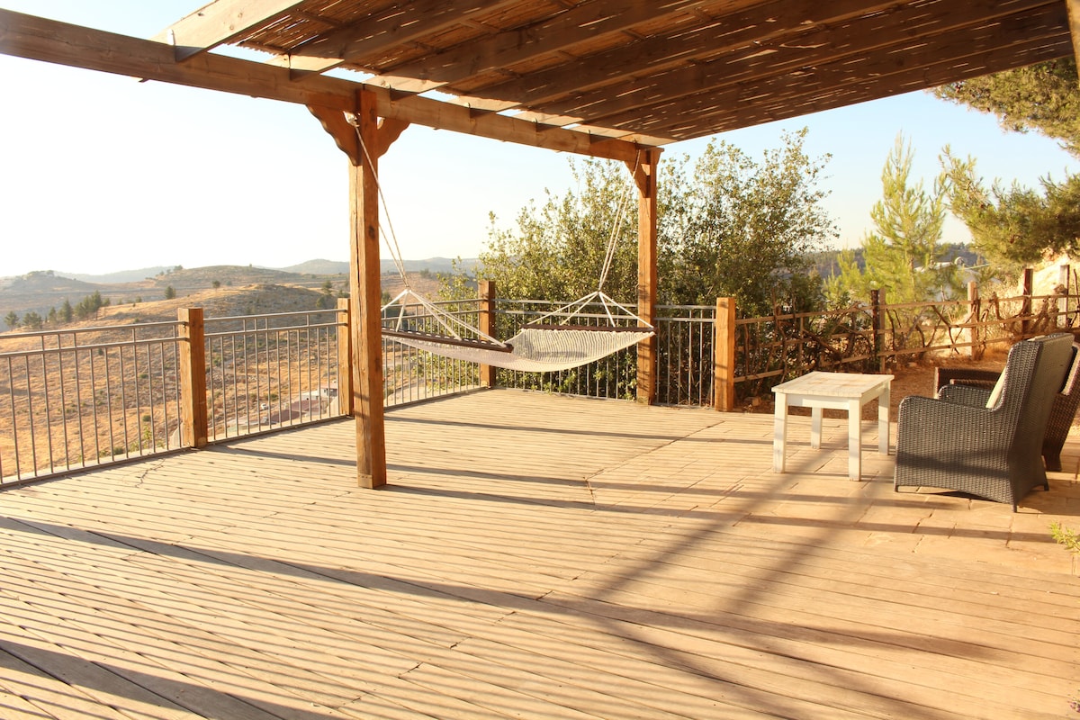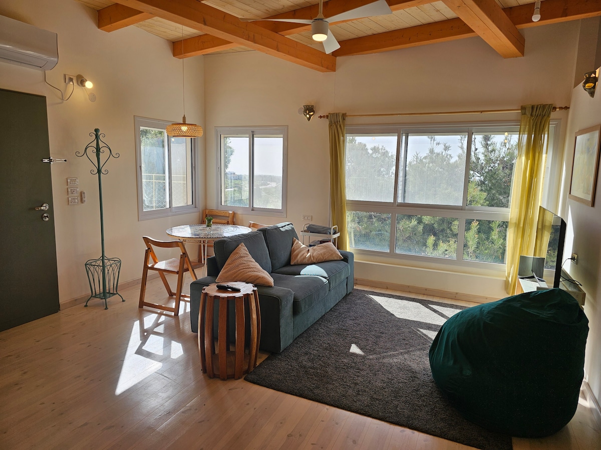 Its located in a small and beautiful village in the nature reserve, "Yatir", on the "Israel National Trail", on the main bird migration route, with a spectacular desert landscape to the east and a forest to the west,about 50 minutes to the Dead Sea, 50 minutes to Be'er Sheva, 50 minutes to Jerusalem and 20 minutes to Arad. The entrance to the unit is through a wooden pergola on the ground, south and bright.