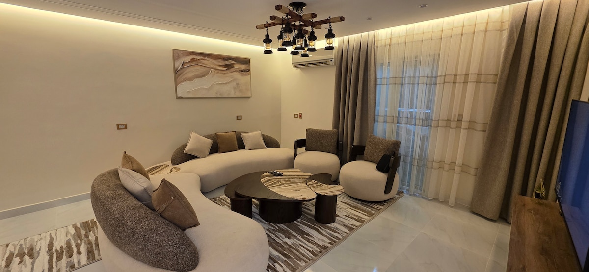 Enjoy luxury in our expansive Presidential Suite with three living areas, a grand dining table, and three bedrooms, including a master suite with a luxurious bath. Benefit from two entrances, enhanced security, and a fully equipped kitchen. Perfectly located just a 5-min walk from City Star Mall and 2-min from City Centre Mall. Includes high-speed Wi-Fi, personalized check-in, and access to an outdoor pool. Ideal for relaxation and entertainment, with an extra bed available on request.