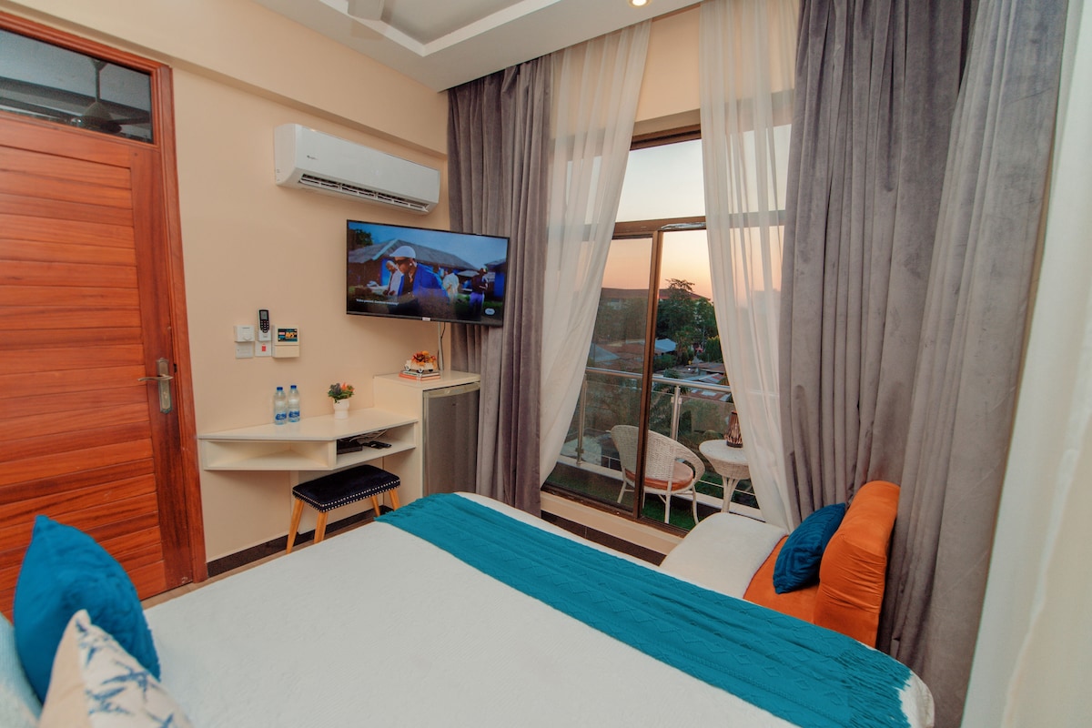 ⸻ Private studio with own entrance and en-suite bathroom. Relax in the serenity of our lush garden in Oyster Bay. Perfectly located just 5 minutes’ walk from lively Haile Selassie’s bars, shops and restaurants. Inside you’ll find a work desk, cozy seating area and a Zanzibar king bed with mosquito net. The studio has air conditioning, fridge, microwave plus complimentary tea, coffee and water. On site is our weaving company, which has crafted the beautiful sheets, curtains and cushions.