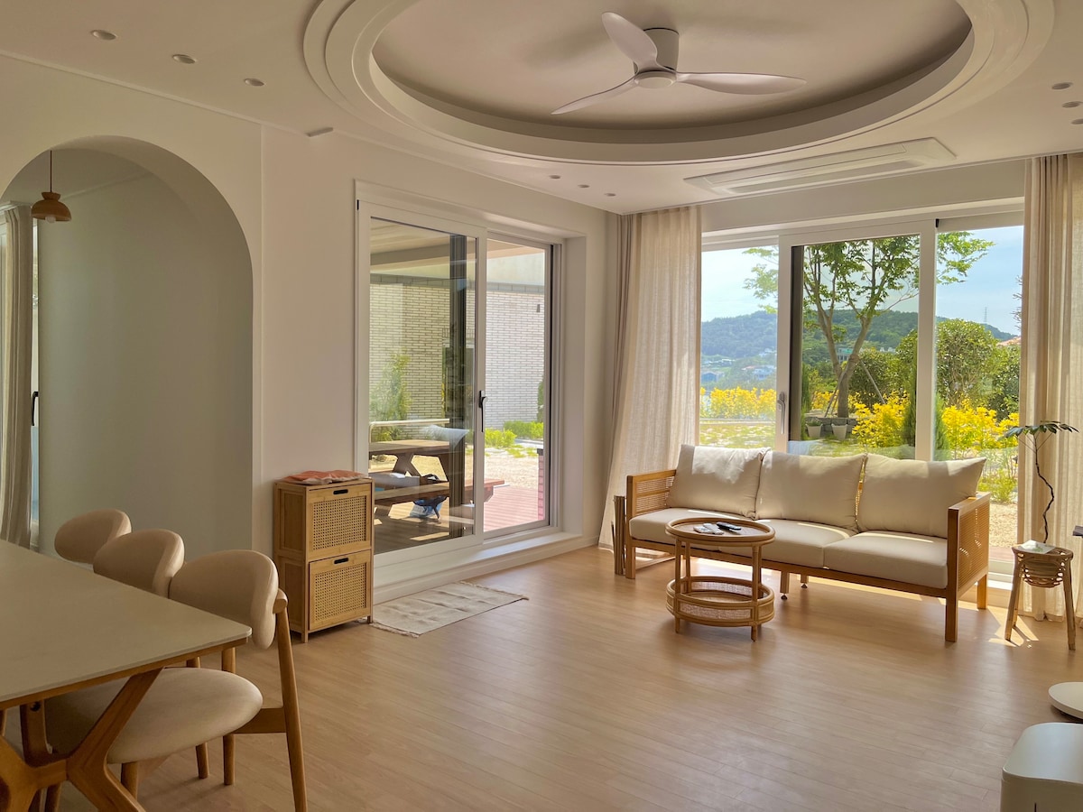 🍀전원주택의 로망을 느낄 수 있는 시골 2층집🍀 바다와 정원이 어우러진 단독주택에서 하루 딱 한팀만 숙박을 받고 있습니다. 조용한 시골에서 꽃과 식물로 가꾸어진 정원과, 단독 사용 가능한 수영장, 멀리 바다가 보이는 오션뷰를 프라이빗하게 누릴 수 있어요. 저녁에는 조용한 시골에서 빔프로젝터와 함께 바베큐를 즐겨보세요 ◡̎ * 사업자 등록 및 정식 숙박업소로 등록된 숙소 * 체크인 4시, 체크아웃 11시 * 유아용 단독 풀장 7/18~8/16 (그외 기간 샤용불가 ❌) * 2층집 전체 단독 사용 (1층, 2층, 마당, 바베큐장) * 바베큐, 불멍 가능