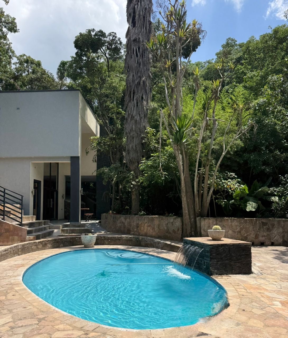 Enjoy this modern but yet vintage styled home located in Borrowdale. The close is within a newly finished 6 unit cluster development named Merewood Estate. Our decor is mixed with vintage & modern pieces put together to make this place a familiar & unique experience. The open plan kitchen gives guests a chance to cook, play, interact with one another all whilst enjoying the fireplace and entertainment provided. Cool off in the splash pool outside or warm up with the full house by the fire pit.