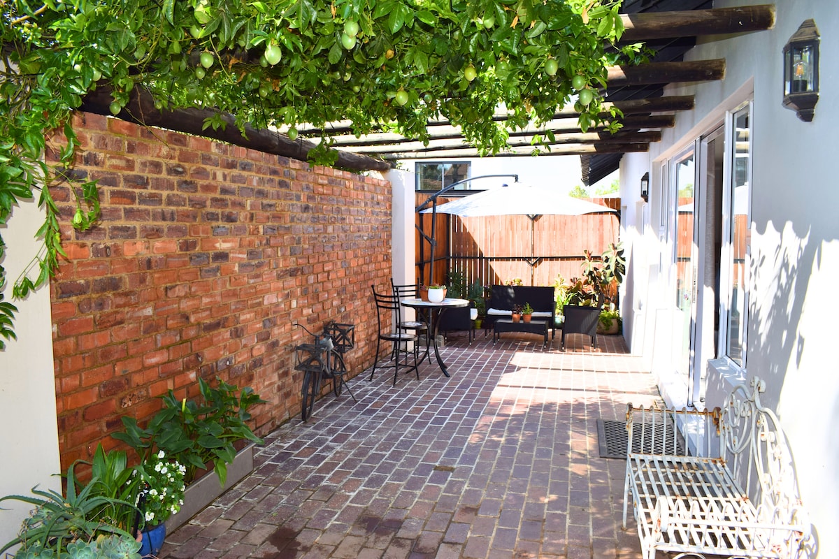 This rustic cottage is perfect for small families with (small friendly, trained) pets, couples, solo travelers and business people. Although located near all amenities, the canopy of trees and farmhouse ambiance will make you feel like you're miles away from the hustle & bustle. The cottage is completely private and equipped; all you need to bring is a bag. There is ample parking, security and a swimming pool available. The cottage is serviced weekly or at your convenience for R120 per day