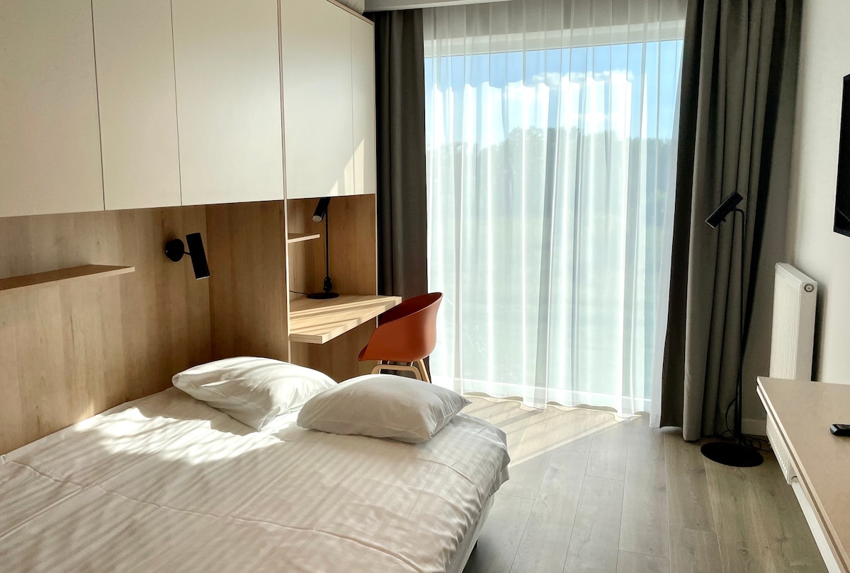 Apartament Wilanów Residence, jest kompaktowym studio dla 2 osób, zlokalizowany w Miasteczku Wilanów. Znajduje się w nim rozkładana sofa, o wymiarach po rozłożeniu 140x200, telewizor, aneks kuchenny, klimatyzacja, łazienka z prysznicem, biurko do pracy, deska, żelazko, sejf. W pokoju jest przestronne okno, sięgające od sufitu do podłogi, nie otwierające się. Natomiast pokój jest klimatyzowany z centralnym nawiewem oczyszczonego powietrza.