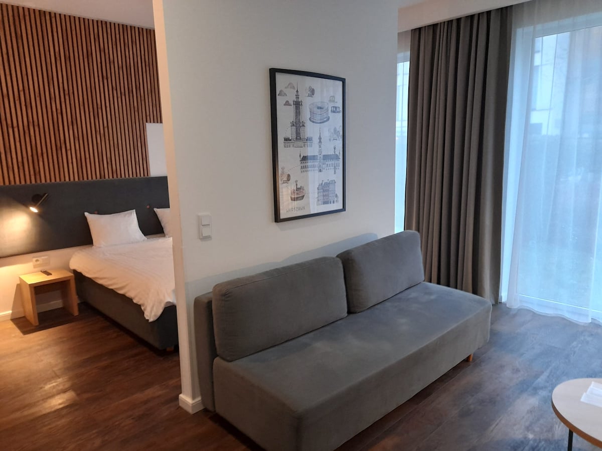 Apartament Wilanów Residence, jest kompaktowym studio dla 2 osób, zlokalizowany w Miasteczku Wilanów. Znajduje się w nim rozkładana sofa 150x200, telewizor, aneks kuchenny, klimatyzacja, łazienka z prysznicem, biurko do pracy, deska, żelazko, sejf.W pokoju jest przestronne okno, sięgające do podłogi, jednak nie otwierające się. Natomiast pokój jest klimatyzowany z centralnym nawiewem oczyszczonego powietrza.