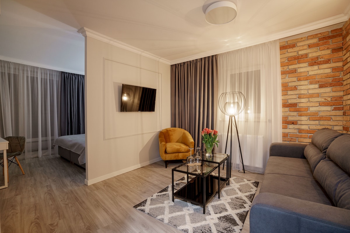 Platinum Hotel&Residence including 71 room and 94 apartments in Classic,Studio and DeLux style, designed in Scandinavian stye '' Less is more''. The simplicity of furniture, natural structure of materials and functionality is the main principle of arranging our units. All this surrounded by greenery, lawns and shrubs. In addition, we offer access to a modern gym for our guests. Platinum Hotel&Residence is non-smoking area. Pets accepted with additional fee.