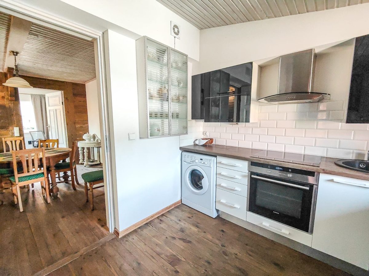Domek przy lesie, z ogrodem, placem zabaw, miejscem do pracy biurowej i szybkim WiFi Mieszkanie 2-pokoje: Sypialnia:TV,2-os łóżko Kuchnia:lodówka,zmywarka,piekarnik,mikrofala,czajnik Salon:8-os stół,WiFi 60Mb/s Łazienka:prysznic,pralka Hol:szafy W wyższym standardzie: -ściany:kamień,stiuk -podłogi:żywica -blaty:kamień -nowe Agd - zdalne oświetlenie - ogrzewanie:nowy piec 2026r Do dypozycji -ogrodzony parking -ogród ławki hamaki huśtawki tyrolka -las -spokój, śpiew ptaków,karmianie wiewiór