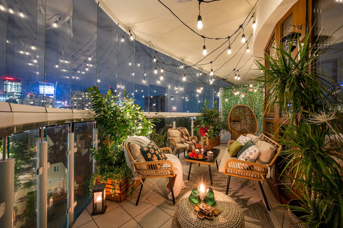 Oferta Premium: przestrzeń i komfort na 68 metrach dla wymagających Gości w centrum Warszawy. Zachwycający prywatny taras z widokiem na panoramę miasta. Prywatność dwóch oddzielnych sypialni, wyposażona kuchnia, estetyczna łazienka, salon, w którym można potańczyć :-), Internet 1Gb, Smart TV. Idealny na dłuższe pobyty. Siłownia, garaż podziemny, dach na ostatnim piętrze, ogródek. Przystanki i metro pieszo od mieszkania. Bezcenne: poranki i wieczory na tarasie i WIDOK na panoramę miasta :)